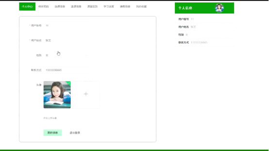 个人中心:在个人中心页面可以对个人中心、修改密码、选课信息、退课信息、课堂签到、学习进度、请假信息、我的收藏等功能进行操作;如图5-4所示: