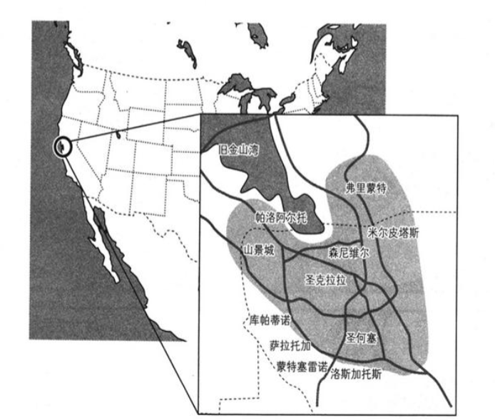 从西北方向依次来看,这些城镇的名称分别为帕洛阿尔托(PaloAlto)(斯坦福大学位于此地)、山景城(MountainView)、森尼维尔(Sunnyvale)(英特尔的竞争CUP厂家AMD位于此地)、圣克拉拉(SantaClara)(生产CPU的大企业英特尔总部位于此地)、圣何塞(SanJose)、米尔皮塔斯(Milpitas)、弗里蒙特(Fremont)等,它们都是沿着旧金山湾西岸发展起来的。最近,硅谷地带在圣何塞处折回正沿着旧金山湾东岸向北逐渐延伸。