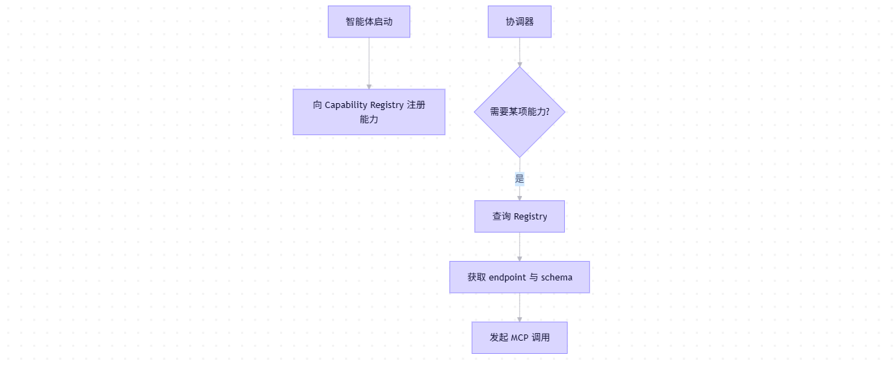 每个支持 MCP 的智能体需通过标准接口声明其能力(Capabilities),包括支持的操作、输入输出格式、依赖资源等。 -