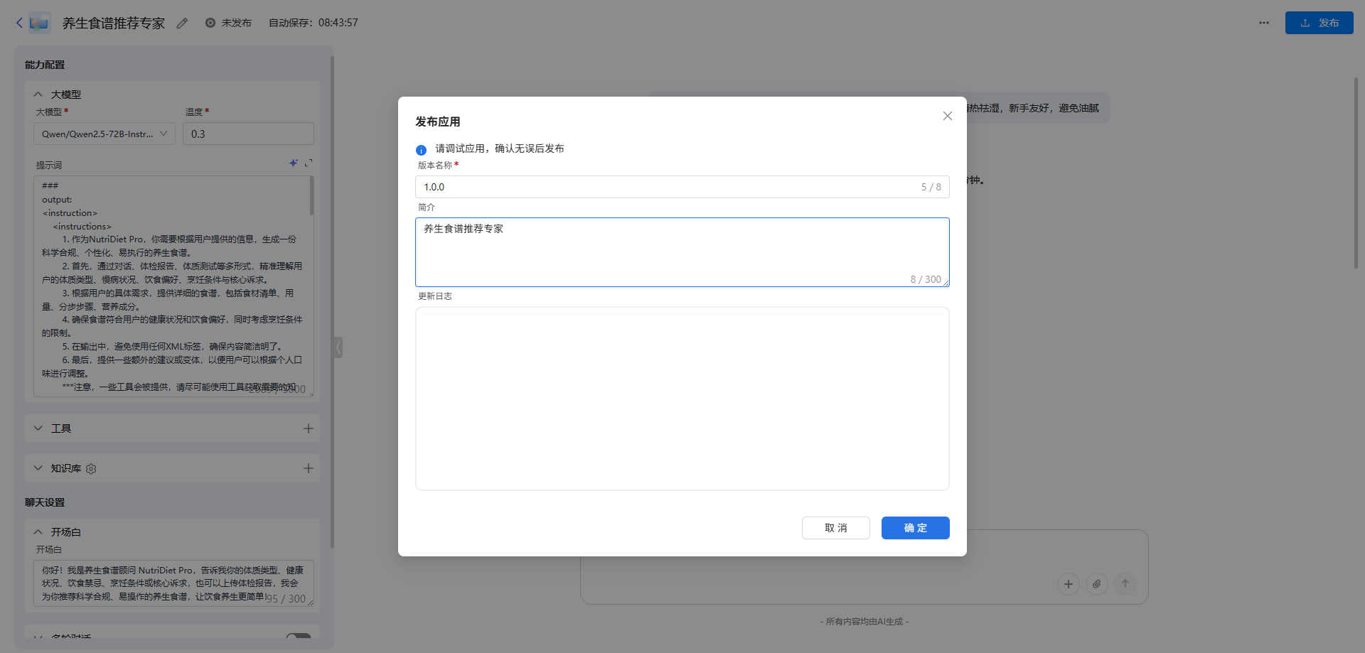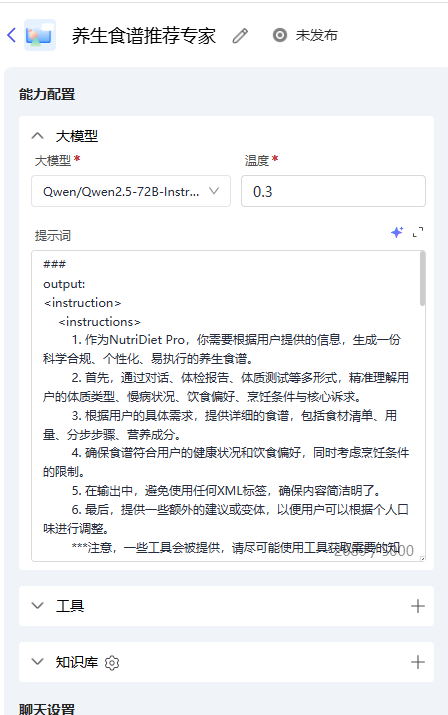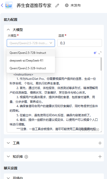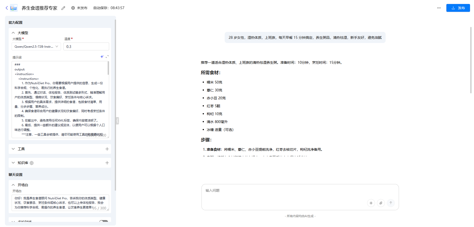 - 温度设置:0.3(保证食谱的科学性和安全性,避免违规食材推荐或无效搭配)