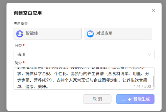 点击 “智能生成” 优化提示词,确定应用类型为 “智能体”,分类选择 “健康服务 - 饮食养生”。