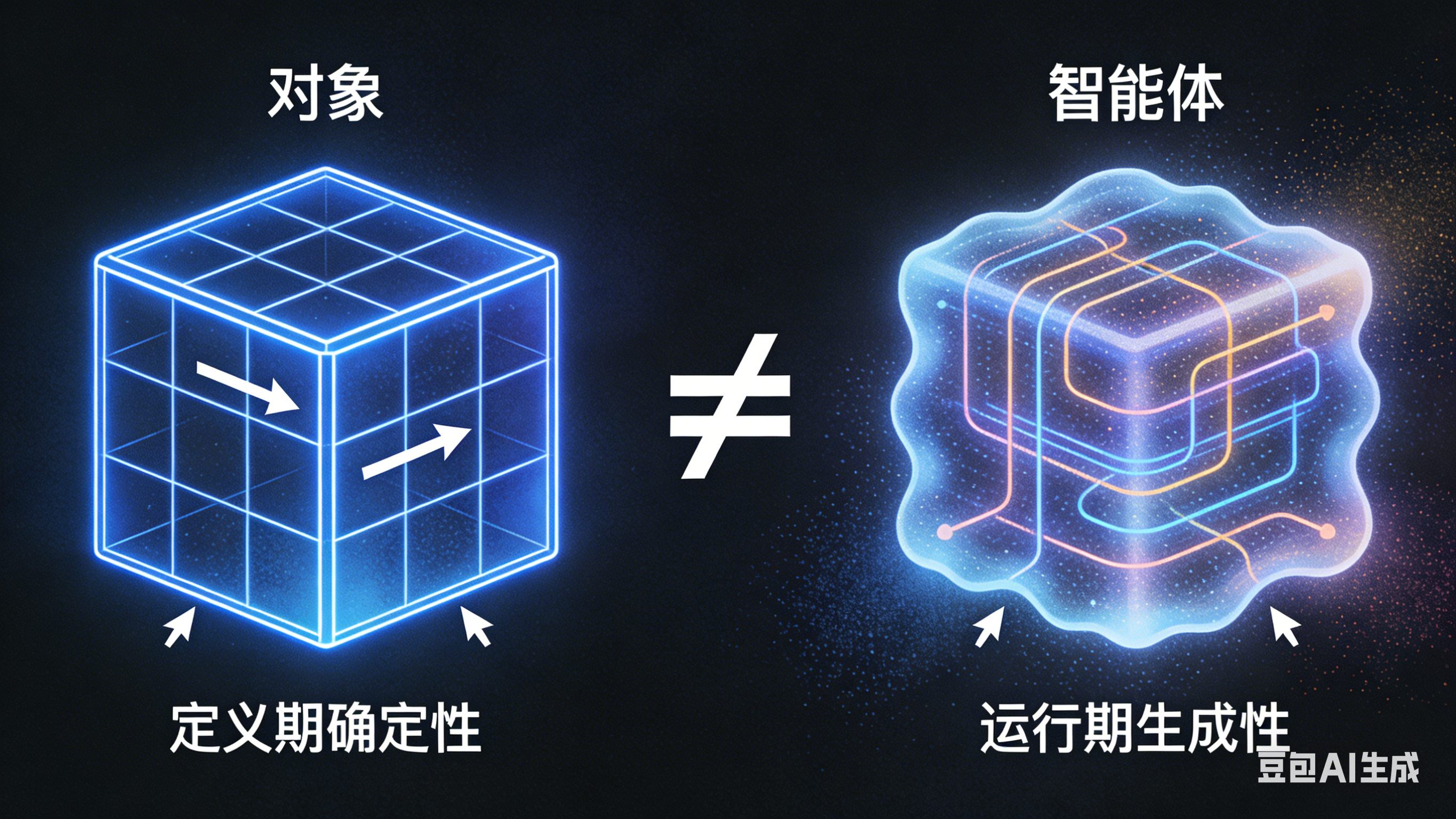 这些因素,有些是代码控制的,有些不是;有些是显式状态,有些是隐性条件;有些你能回溯,有些你只能推测。你会发现一个很微妙的变化:Agent 的行为,开始具有“运行期生成性”,而不是“定义期确定性”。在这种前提下,如果你还用“对象 = 行为载体”来理解Agent,就会开始感到不安。不是因为这个抽象错了,而是它假设的世界已经变了。