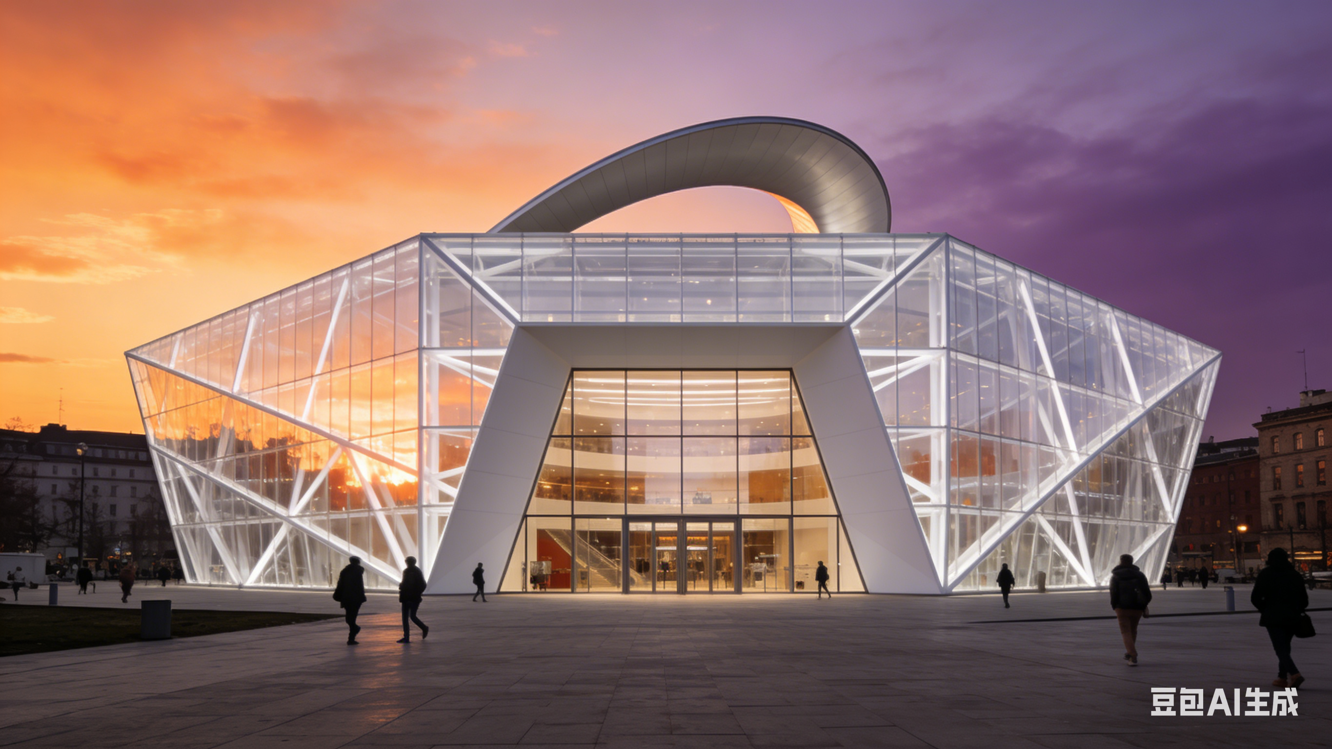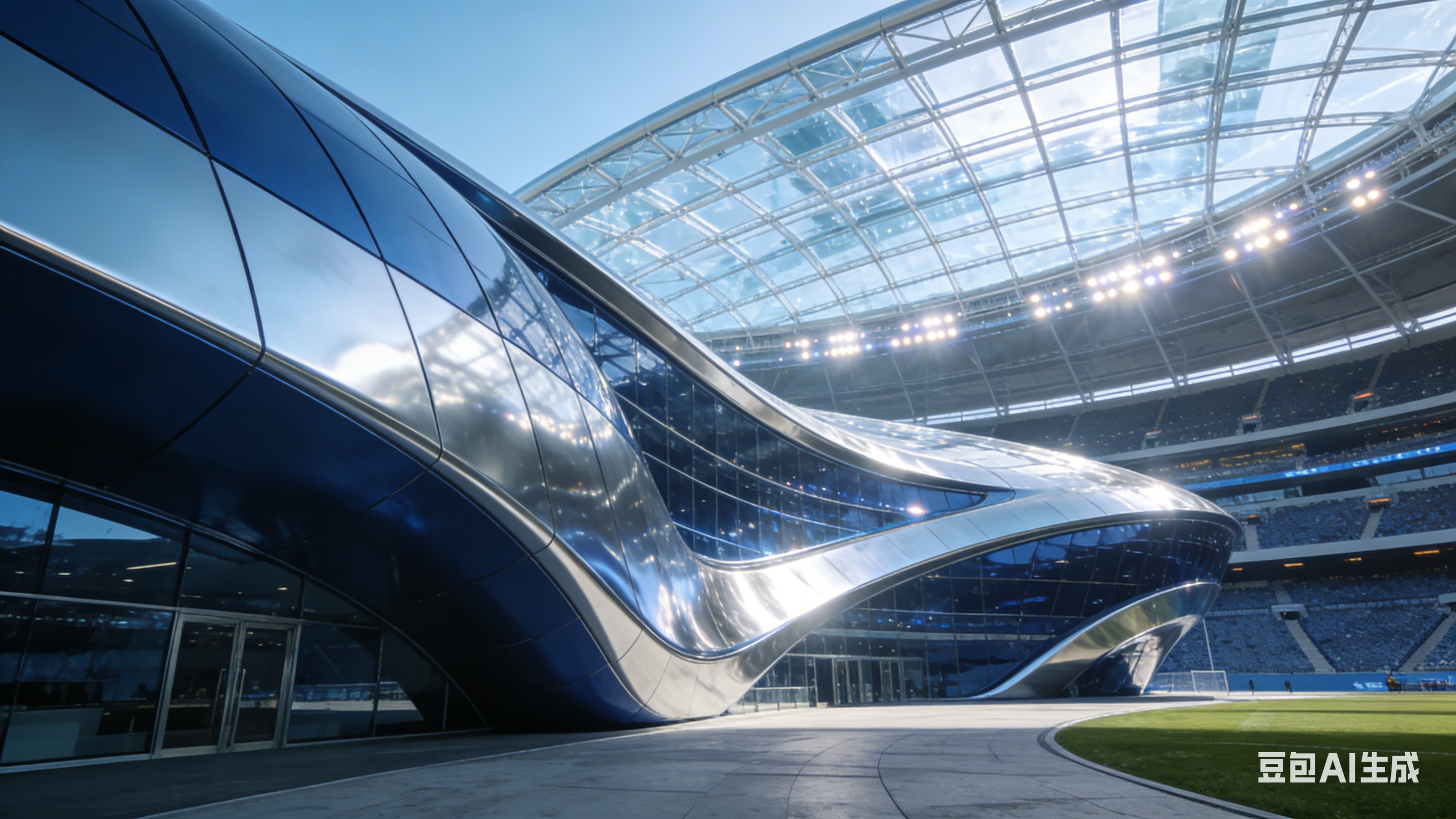 一座流线型设计的现代化体育场馆,外面采用银色与深蓝色的金属材质,在阳光下闪耀着未来科技的光芒。巨大的穹顶采用透明材料,自然光与内部LED照明交 相辉映,营造出既明亮又梦幻的空间感。场馆外立面装饰着动态变化的LED屏幕,正播放着赛事预告及与观众互动内容,展现着现代体育的活力与魅力。入口处, 流线型的玻璃门与智能识别系统融为一体,彰显着科技与便利的完美结合。 |