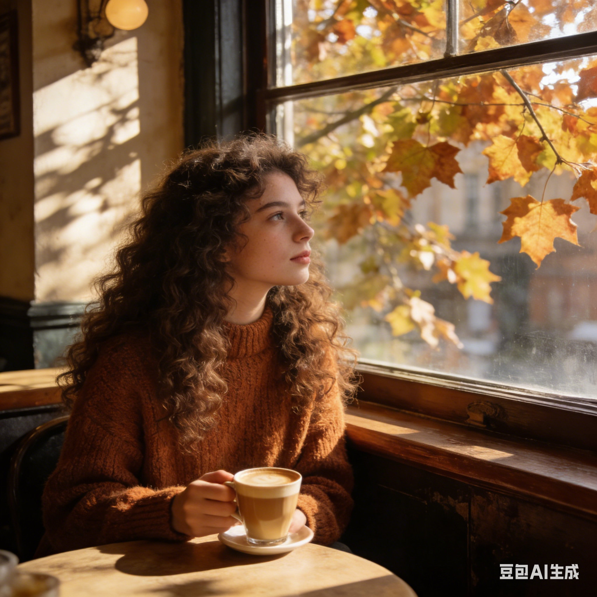 复古咖啡馆的落地窗边,一个留着蓬松羊毛卷的女孩坐在木质椅子上。她穿着焦糖色的针织毛衣,卷发自然垂落在肩头,发尾带着微微的卷度。手中拿着一杯热拿铁,目光望向窗外的街道,窗外的梧桐树叶泛黄,阳光透过树叶的缝隙洒在她的头发上,形成斑驳的光影,画面充满复古文艺气息。 |