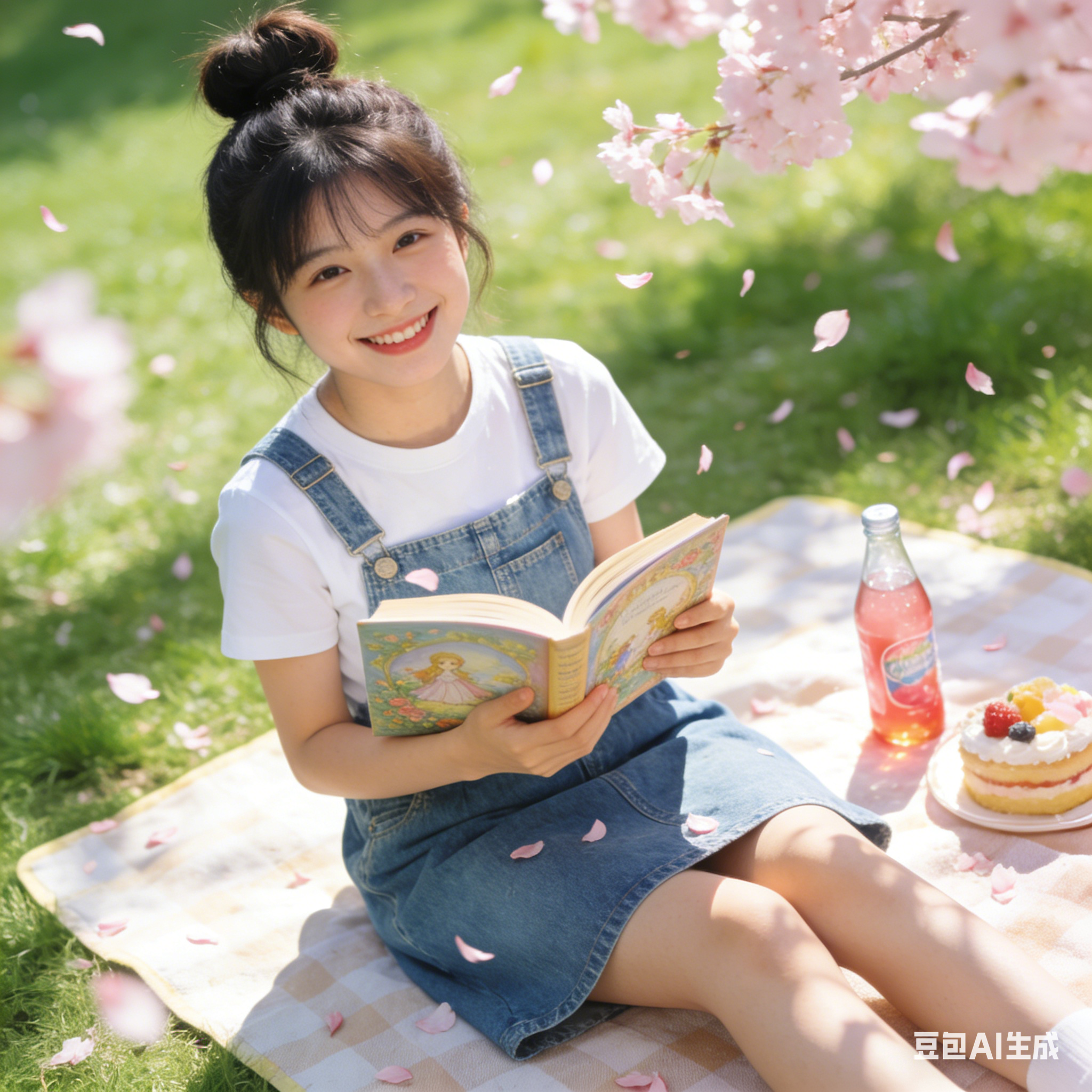 阳光明媚的校园草坪上,一个扎着高丸子头的女孩坐在野餐垫上。她穿着白色短袖和牛仔背带裙,丸子头俏皮地立在头顶,碎发被风吹起。手中拿着一本童话书,嘴角带着甜甜的笑容,身旁放着草莓味的汽水和精致的小蛋糕,身后的樱花树随风飘落花瓣,画面清新又治愈。 |
