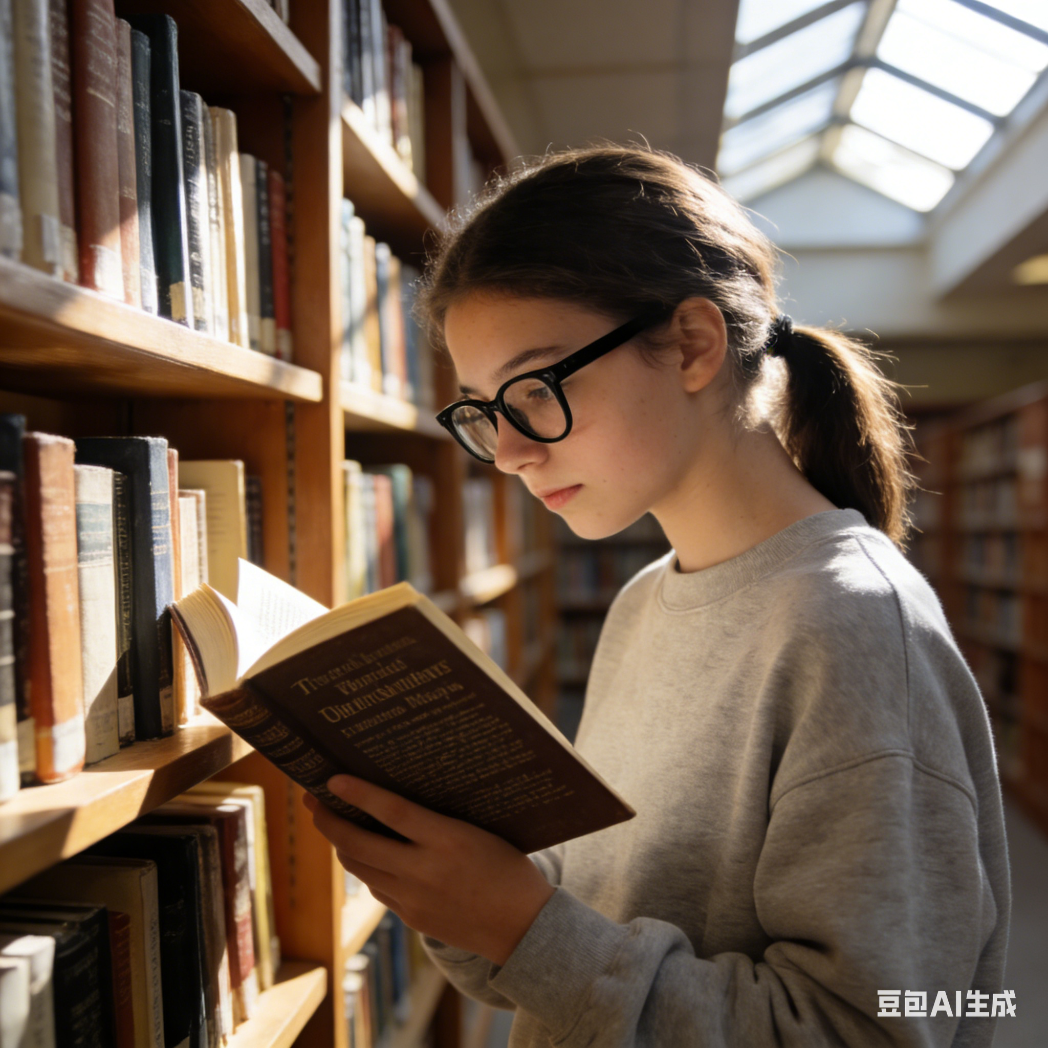图书馆的书架旁,一个戴着黑框眼镜的女孩正在认真看书。她穿着浅灰色的卫衣,头发扎成低马尾,手中拿着一本厚厚的文学名著,目光专注地落在书页上。书架上摆满了各种书籍,阳光透过图书馆的天窗洒在她的身上,画面安静又充满书香气。 |