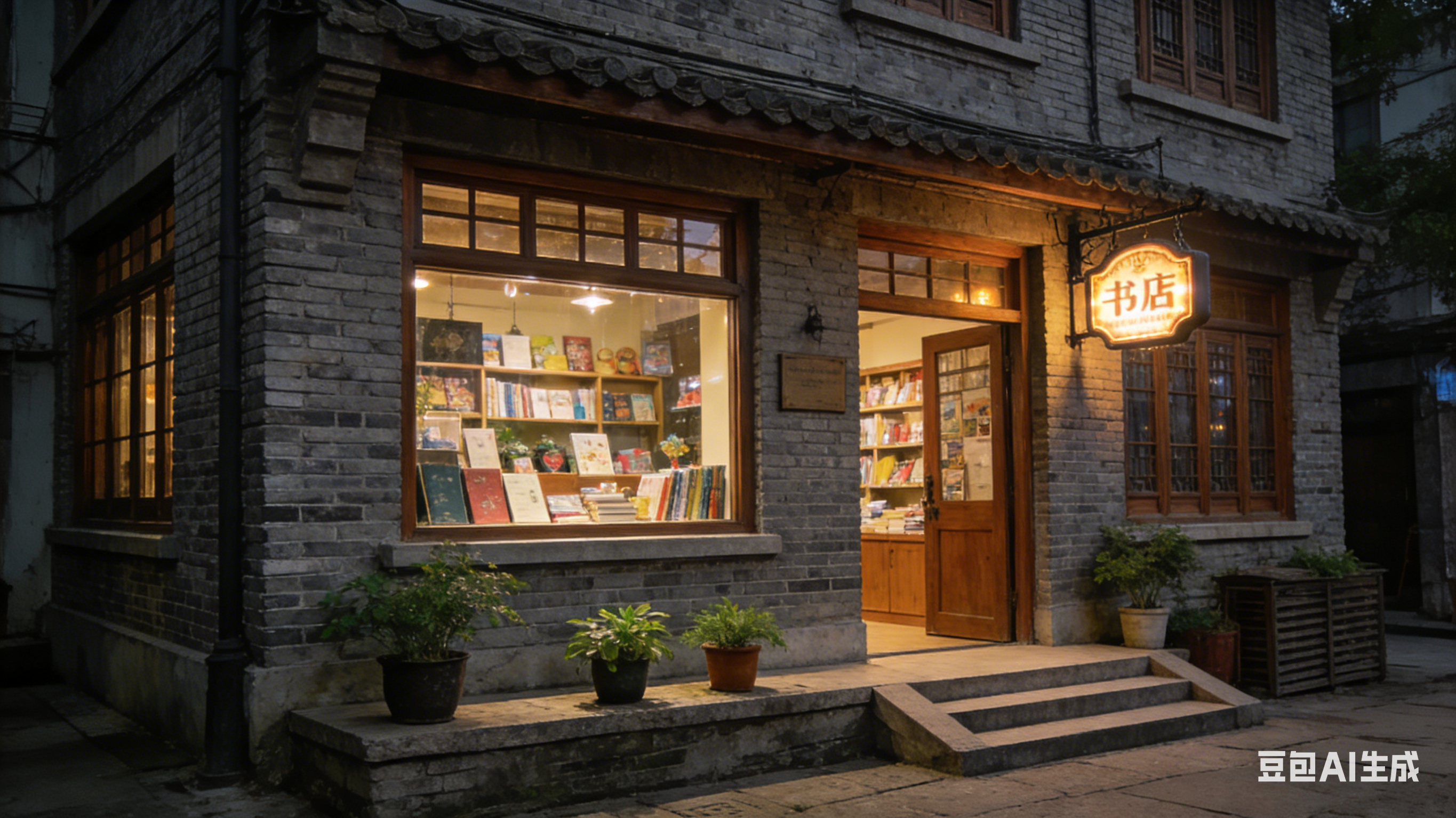 一座复古的书店坐落在城市的老街,整体造型采用民国风格,灰色的砖墙搭配木质的门窗,十分有年代感。书店的门口有一个小小的台阶,台阶上摆放着几盆绿植。书店的橱窗里展示着各种书籍和文创产品,门口挂着一个复古的招牌,夜晚时,招牌上的灯光亮起,画面复古又温馨。 |
