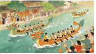 一幅端午赛龙舟的中国风格画作,画面中几条龙舟在江河上竞渡。龙舟装饰精美,龙头威武,龙尾飘逸。船上的划手们身着统一的服装,动作整齐划一,奋力划桨。岸边挤满了观众,有的观众在呐喊助威,有的观众在放鞭炮。背景中有古色古香的建筑和翠绿的树木,江面波光粼粼,画面热闹非凡,充满了节日的氛围。 |