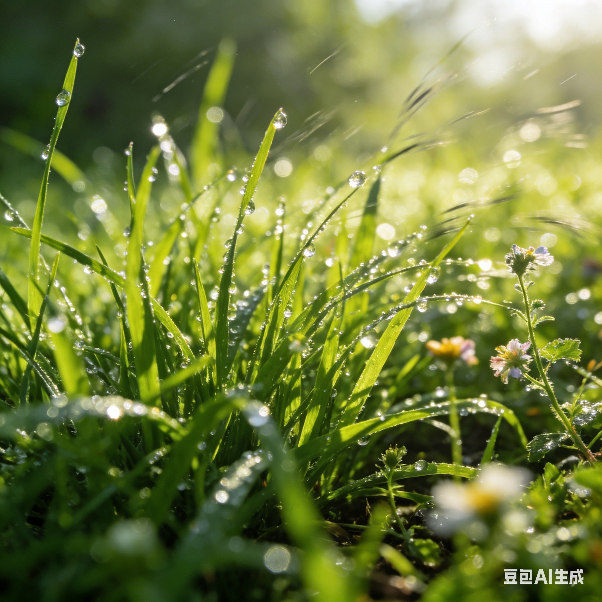 清晨的草坪上,嫩绿的小草上沾满了晶莹的露珠。小草密密麻麻地生长着,呈现出勃勃生机。阳光洒在草坪上,露珠反射出耀眼的光芒。旁边有几朵小野花点缀其间,微风拂过,小草随风摇曳,仿佛在向人们展示生命的活力,画面清新又充满生机。 |