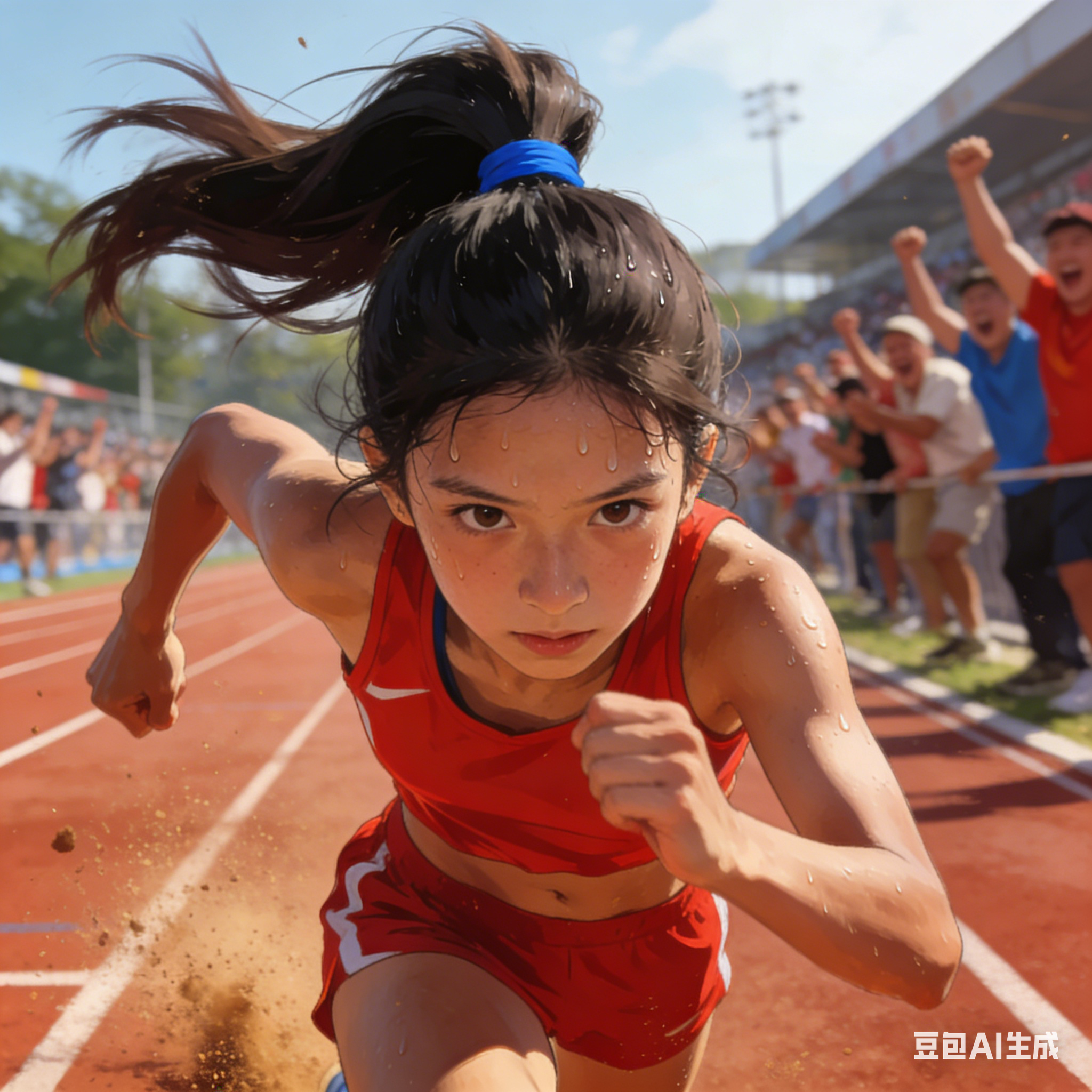 田径场上,一个扎着高马尾的女孩正在冲刺。她穿着红色的运动服,马尾辫随着奔跑的动作高高扬起,发绳是鲜艳的蓝色。额头布满细密的汗珠,眼神坚定,双臂奋力摆动,脚下的跑道扬起微微的尘土,背景中还有其他运动员和加油的观众,画面充满活力与动感。 |