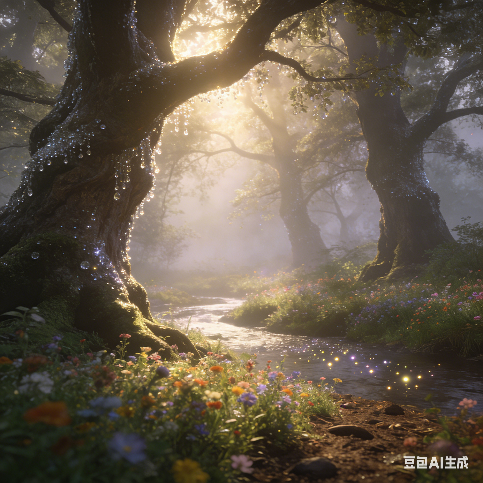 示例:梦幻般的森林,晨光穿透轻盈的雾气,照亮了古老而神秘的树木。树干上覆盖着晶莹的露珠,反射着柔和的光。地面上铺满了五彩斑斓的野花,仿佛是大自然最绚烂的织锦。远处,轻柔的溪流在静谧中潺潺流淌,水面上漂浮着点点荧光,宛如星辰落入凡间。空气中弥漫着淡淡的花香与泥土的清香,营造出一个远离尘嚣、宁静致远的梦幻之境。 |