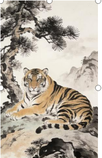 一幅竖幅的国画老虎图,画面中一只老虎卧于山岗之上。老虎身形矫健,毛色金黄,黑色的条纹清晰可见,眼神威严,仿佛能震慑山林。老虎的身旁有几棵苍劲的松树,松针茂密,山石嶙峋。背景采用淡墨渲染,营造出深远的意境。整幅画面笔墨苍劲有力,将老虎的王者风范展现得淋漓尽致,同时也体现了中国国画的笔墨韵味。 |