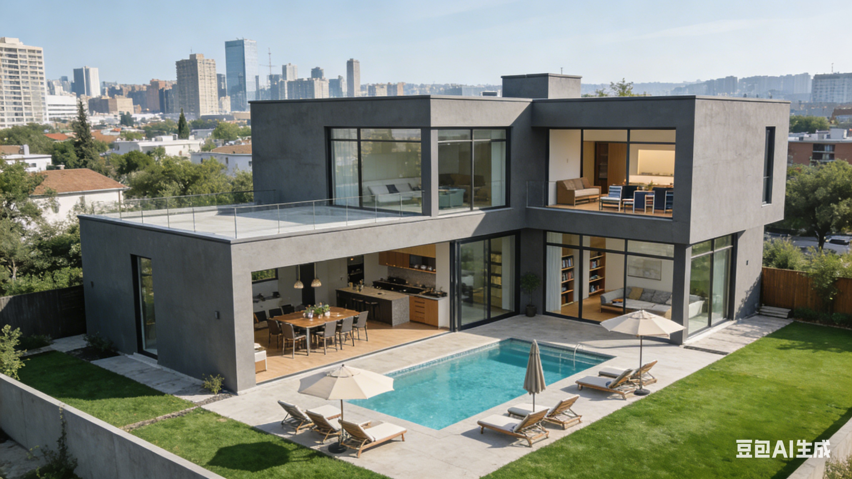 一座时尚的独栋住宅坐落在城市的郊区,整体造型采用现代简约风格,灰色的外墙搭配大面积的玻璃窗户,线条简洁大方。住宅的一层有一个开放式的客厅和餐厅,二层是卧室和书房。院子里有一个游泳池,周围摆放着躺椅和遮阳伞,还有一片绿色的草坪,画面时尚又舒适。 |