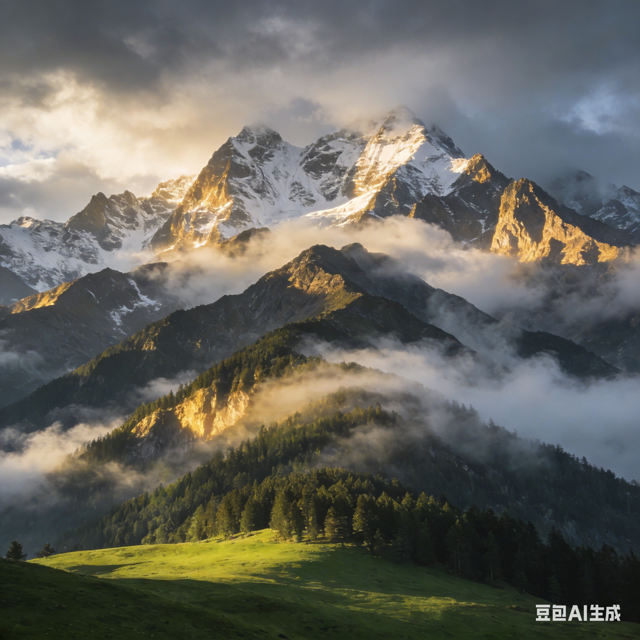 连绵起伏的群山在云雾中若隐若现。山峰高耸入云,山顶覆盖着皑皑白雪,山腰处是郁郁葱葱的森林,山脚是一片碧绿的草原。云雾缭绕在山间,仿佛给群山披上了一层神秘的面纱。阳光透过云雾洒在山峰上,形成金色的光影,画面雄伟又壮丽。 |