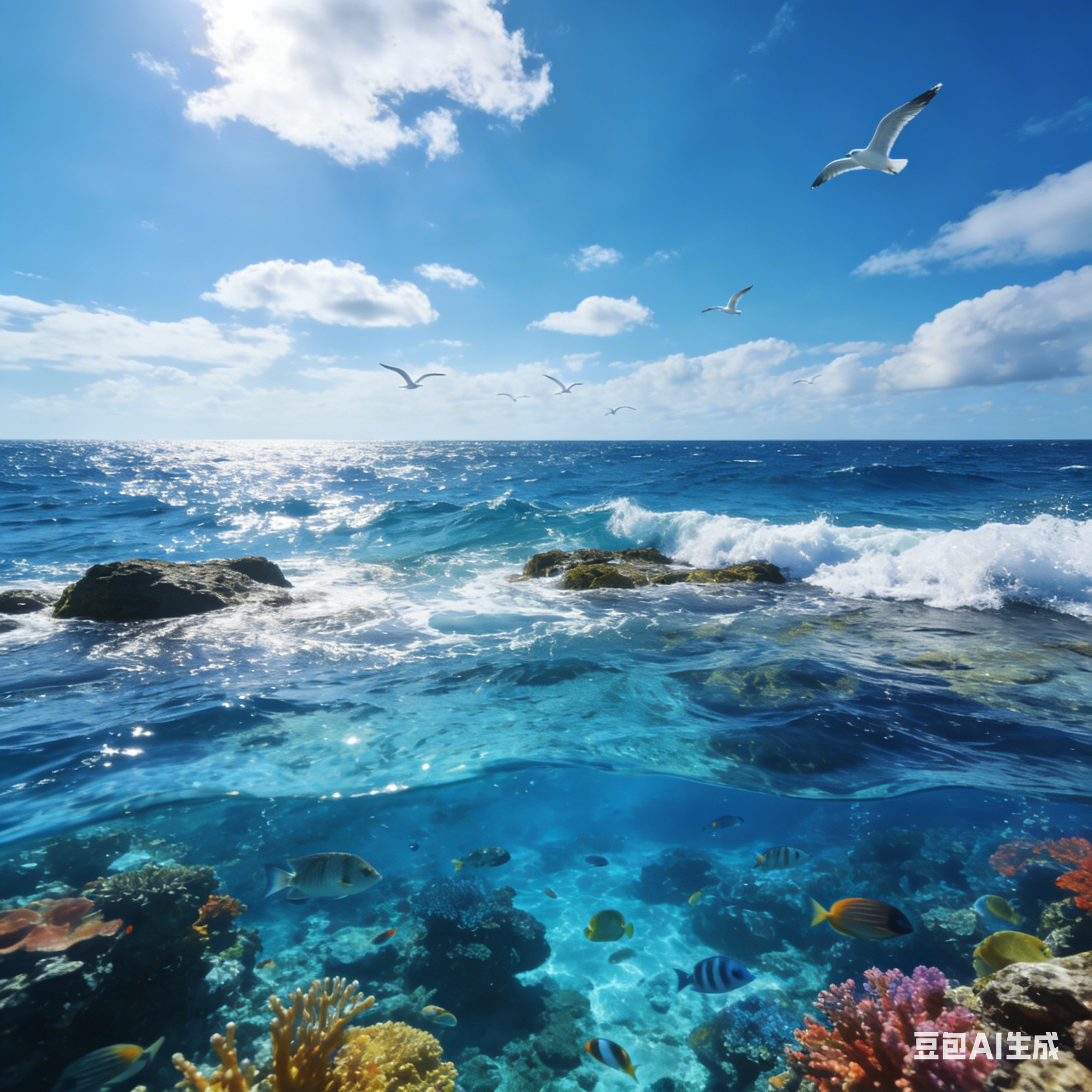 广阔的海洋上,湛蓝的海水与天空相接。海水清澈见底,近处可以看到五彩斑斓的珊瑚和穿梭其中的热带鱼。海面上波光粼粼,白色的浪花轻轻拍打着礁石,远处有几只海鸥在翱翔,天空中飘着几朵白云,阳光洒在海面上,让海水呈现出深浅不一的蓝色,画面清新又壮阔。 |