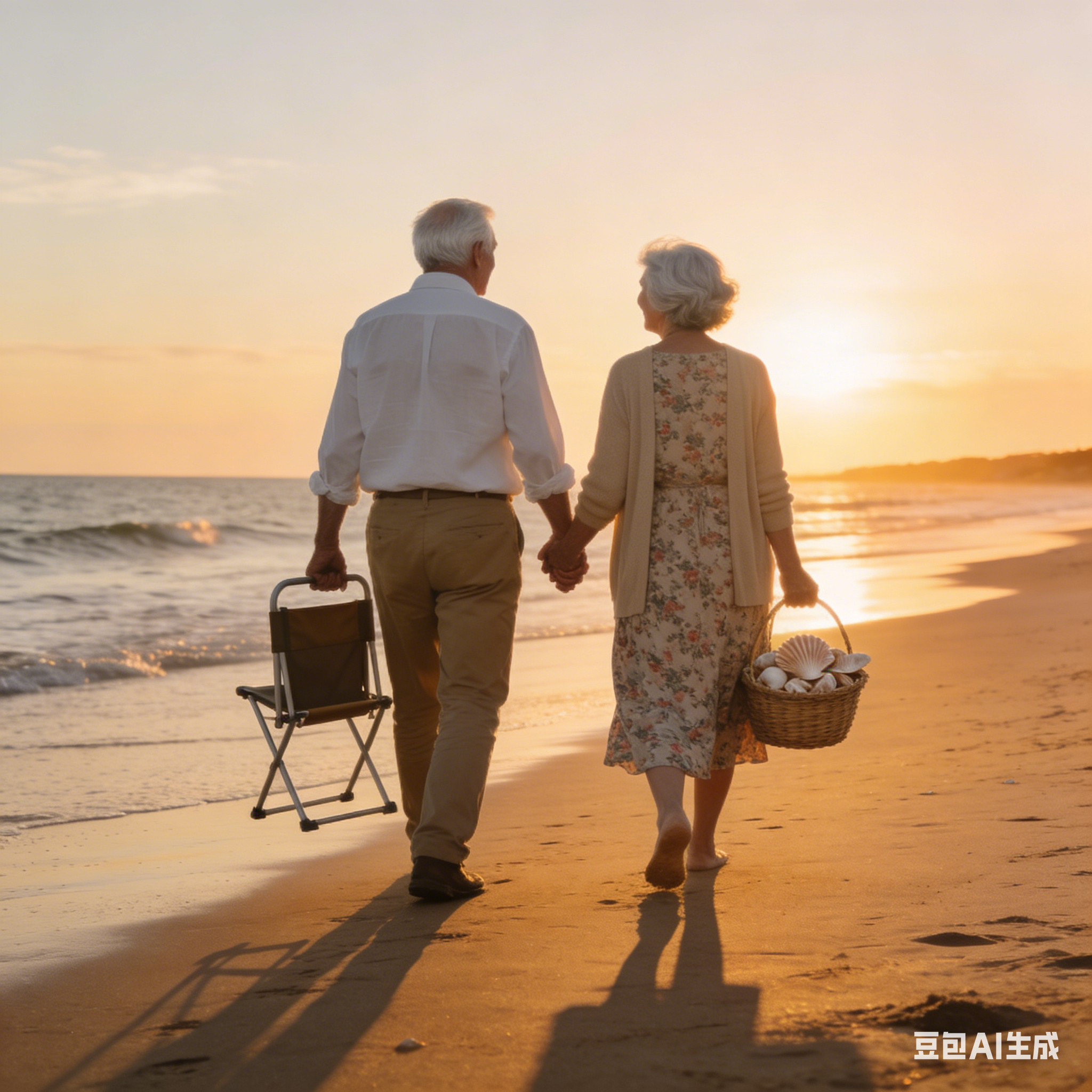 夕阳下的海边沙滩上,一对老夫老妻手牵着手漫步。老爷爷穿着白色的衬衫和卡其色裤子,老奶奶穿着碎花连衣裙,外搭一件米色的针织开衫。他们的头发已经花白,脸上布满皱纹,但笑容却十分温暖。老爷爷手中拿着一把折叠椅,老奶奶手中提着一个装满贝壳的小篮子,夕阳将他们的身影拉得很长,画面温馨又浪漫。 |