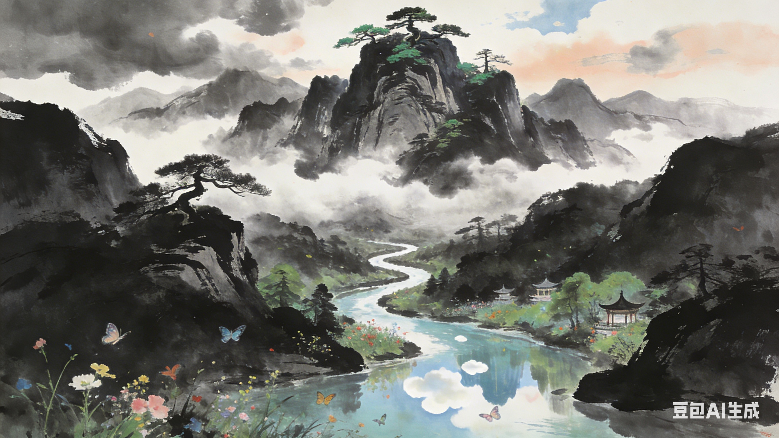 画面缓缓展开,首先映入眼帘的是一座巍峨挺拔的主峰,它矗立于画面中央偏上位置,山峰层峦叠嶂,云雾缭绕其间,仿佛是天与地的交界,既神秘又庄严。山 峰之上,古松苍翠,枝干虬曲,展现出顽强的生命力。它们或立于峭壁之上,或隐于云雾之间,为这静谧的山林增添了几分生气。 随着视线下移,一条蜿蜒曲折的溪流从山间潺潺流出,溪水清澈见底,倒映着两岸的青山绿树,以及天空中飘浮的几朵白云。溪边,野花烂漫,彩蝶飞舞,一片 生机勃勃的景象。溪流旁,隐约可见几处亭台楼阁,它们或依山而建,或临水而居,与自然景观融为一体,彰显出古代文人雅士追求自然和谐的生活态度。 在画面的远处,群山连绵,云雾缭绕,形成了一幅幅动人的水墨画卷。这些远山虽不及主峰那般雄伟,却以它们独特的姿态和色彩,为整幅画面增添了层次感和 深度。同时,远处的天空也被染上了淡淡的墨色,与群山相呼应,营造出一种宁静而深远的氛围。 整幅画面以墨色为主,辅以淡彩,通过浓淡干湿、疏密曲直的笔墨技法,将中国山水画的意境之美展现得淋漓尽致。观者仿佛能够穿越时空,置身于那片古老而神秘的山水之间,感受那份来自心灵深处的宁静与和谐。 |