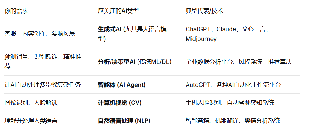 分析/决策型AI:分析数据、预测趋势、做出决策。例如推荐系统、风险评估模型,输出通常是预测或分类。