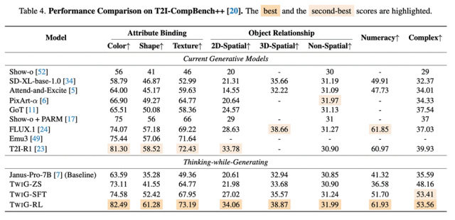 实验数据显示,经过RL训练的TwiG-RL,在T2I-CompBench++的多个关键组合与空间指标上,展现出与Emu3、FLUX.1等模型具有竞争力、甚至在部分维度上更优的表现。