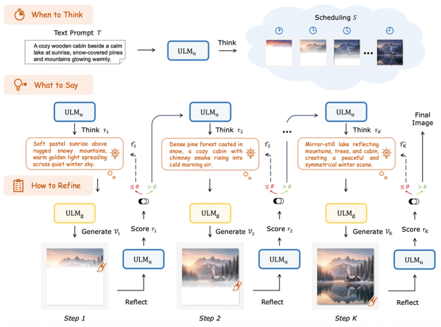1. When to Think(何时思考):模型首先会根据用户的Prompt(提示词),规划出一个“思维时间表”。研究发现,将画面生成过程拆解为3个阶段效果最佳,这恰好符合图像通常包含“上部背景、主体内容、下部背景”的语义结构。