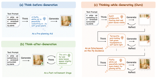 近日,来自香港中文大学、美团等机构的研究团队提出了一种全新的范式——Thinking-while-Generating(TwiG)。这是首个在单一生成轨迹中、以局部区域为粒度,将文本推理与视觉生成深度交织(Interleave)的框架。