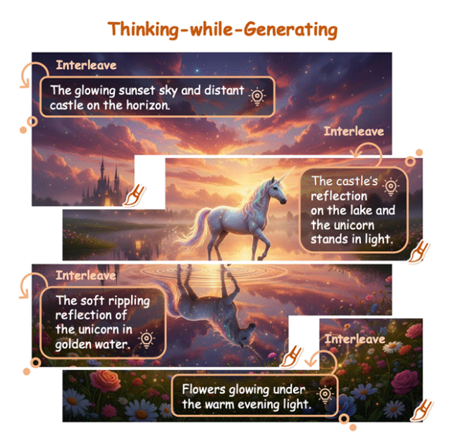 在TwiG的框架下,视觉生成不再是一个黑盒的连续过程,而是被拆解为“生成-思考-再生成”的循环。模型会在绘制过程中多次“暂停”,插入一段文本推理(Thought),用于总结当前的视觉状态,并指导接下来的生成。