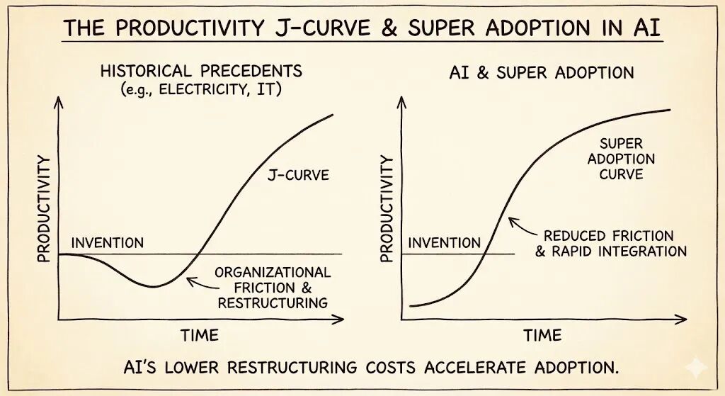 历史先例,如电力的普及或IT革命,展示了一种被称为「生产力J曲线」的现象。