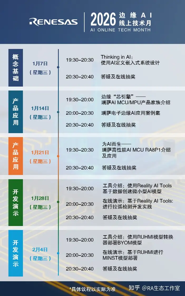 自 2026 年 1 月 7 日起,瑞萨将举办为期一个月的 边缘AI线上技术月,同步开启 瑞萨AI评测挑战赛,帮助开发者从入门到完成第一个AI项目。