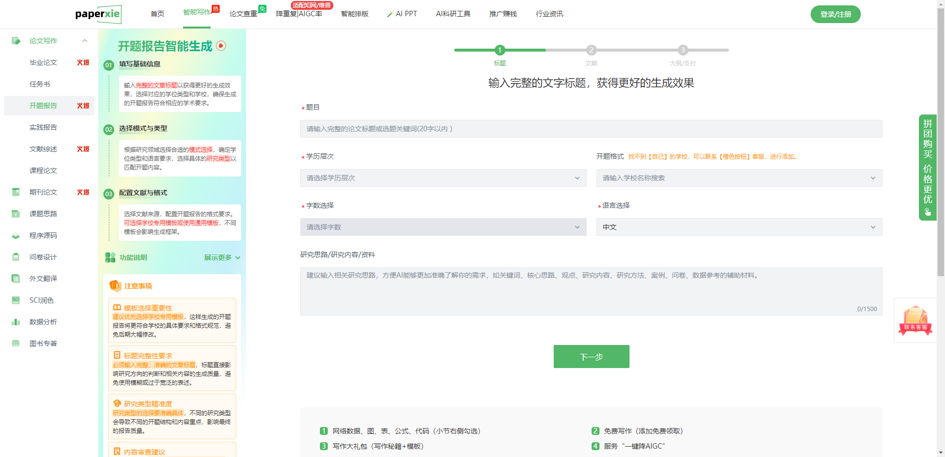 因此,PaperXie 将整个开题报告创作过程分解为三个关键步骤: