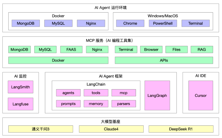 要打造一套工程化、可维护的AI Agent系统,我们需要的不只是模型,而是一整套“生态系统”:运行环境、编程工具集(MCP 服务)、框架体系、监控体系、开发IDE以及底层模型基座。