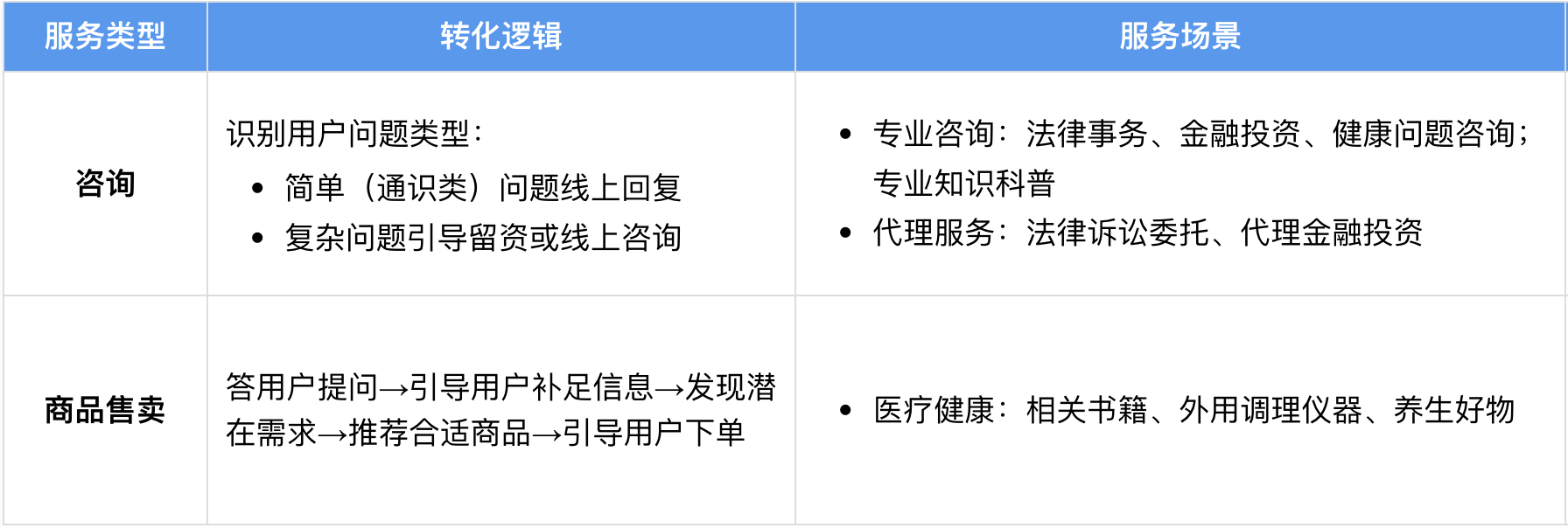 专业服务行业用户的核心诉求是获得垂直领域内专业可信的咨询指导,以及委托代理解决方案,对智能体的专业性和可信度要求较高。基于此,可构建两大服务转化模式:一是在法律、金融、医疗领域,由专家或专业机构提供一对一专业咨询、全流程委托代理服务;二是针对医疗领域,售卖医疗健康类、养生类等商品。