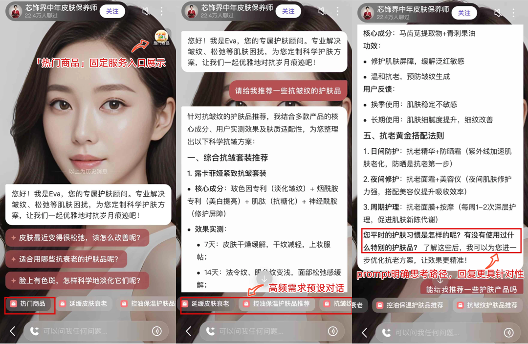 - 以该智能体为例,其围绕中年皮肤保养的核心定位,预设「抗皱纹护肤品推荐」等贴合中年群体的快捷对话指令,既精准匹配用户高频需求,又能通过专业且具引导性的预设回复文本,自然推动用户向下单转化。