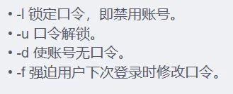 -c, -d, -m, -g, -G, -s, -u以及-o等,这些选项的意义与useradd命令中的选项一样,可以为用户指定新的资源值usermod -s /bin/ksh -d /home/z –g developer sam 此命令将用户sam的登录Shell修改为ksh,主目录改为/home/z,用户组改为developer -