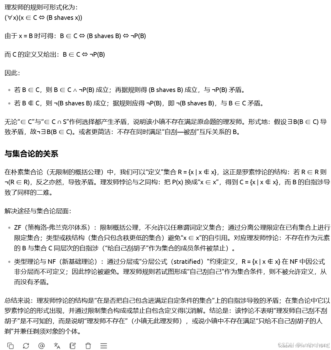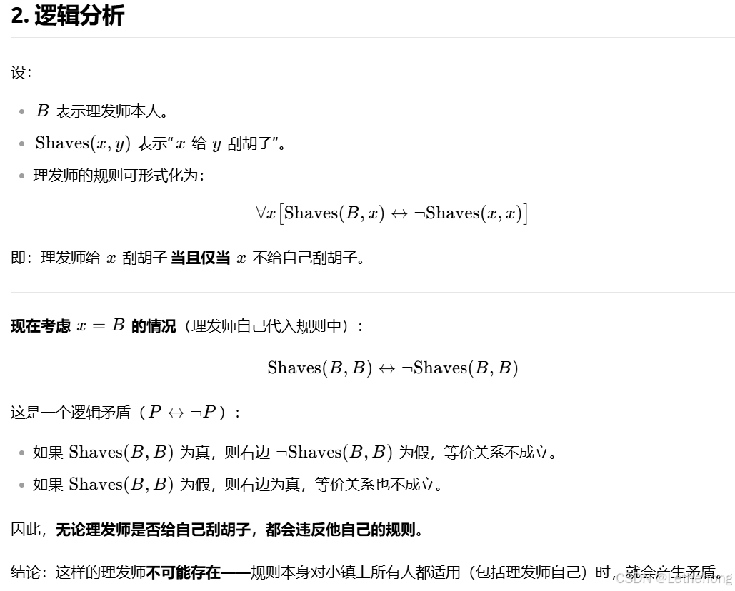 清晰地解释了“理发师悖论”的逻辑矛盾:如果理发师给自己刮胡子,则违反“只给不自己刮胡子的人刮胡子”的规则;如果不给自己刮,则又符合被自己刮的条件,形成循环矛盾。