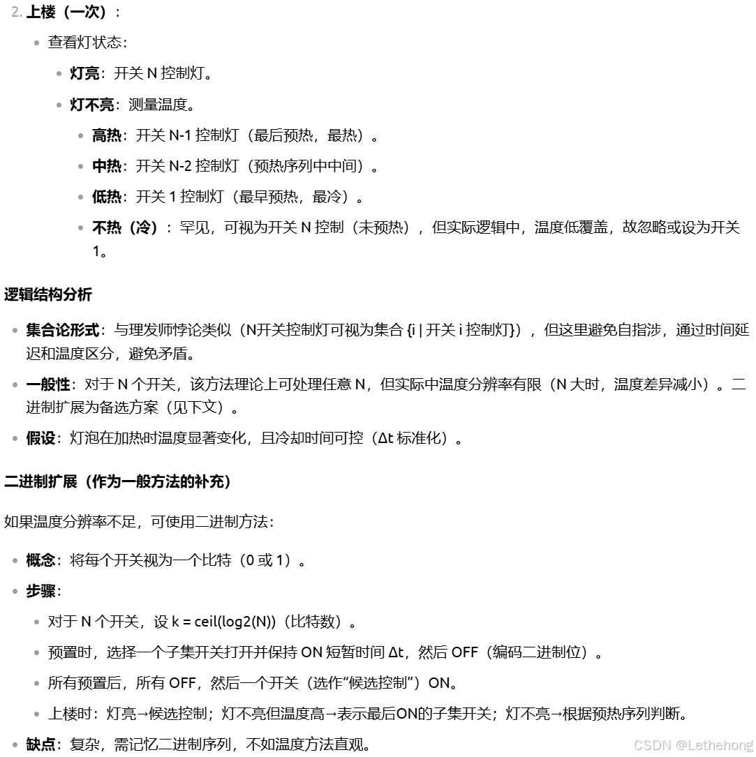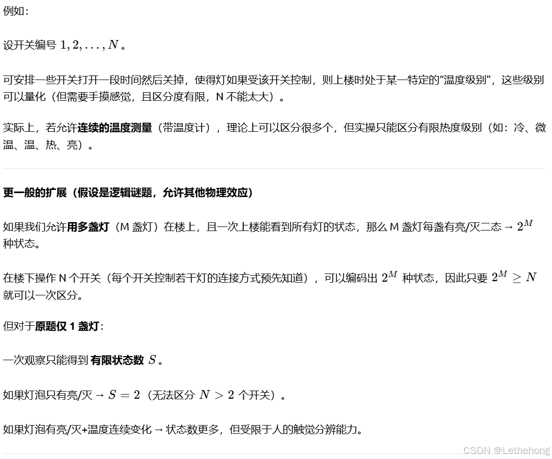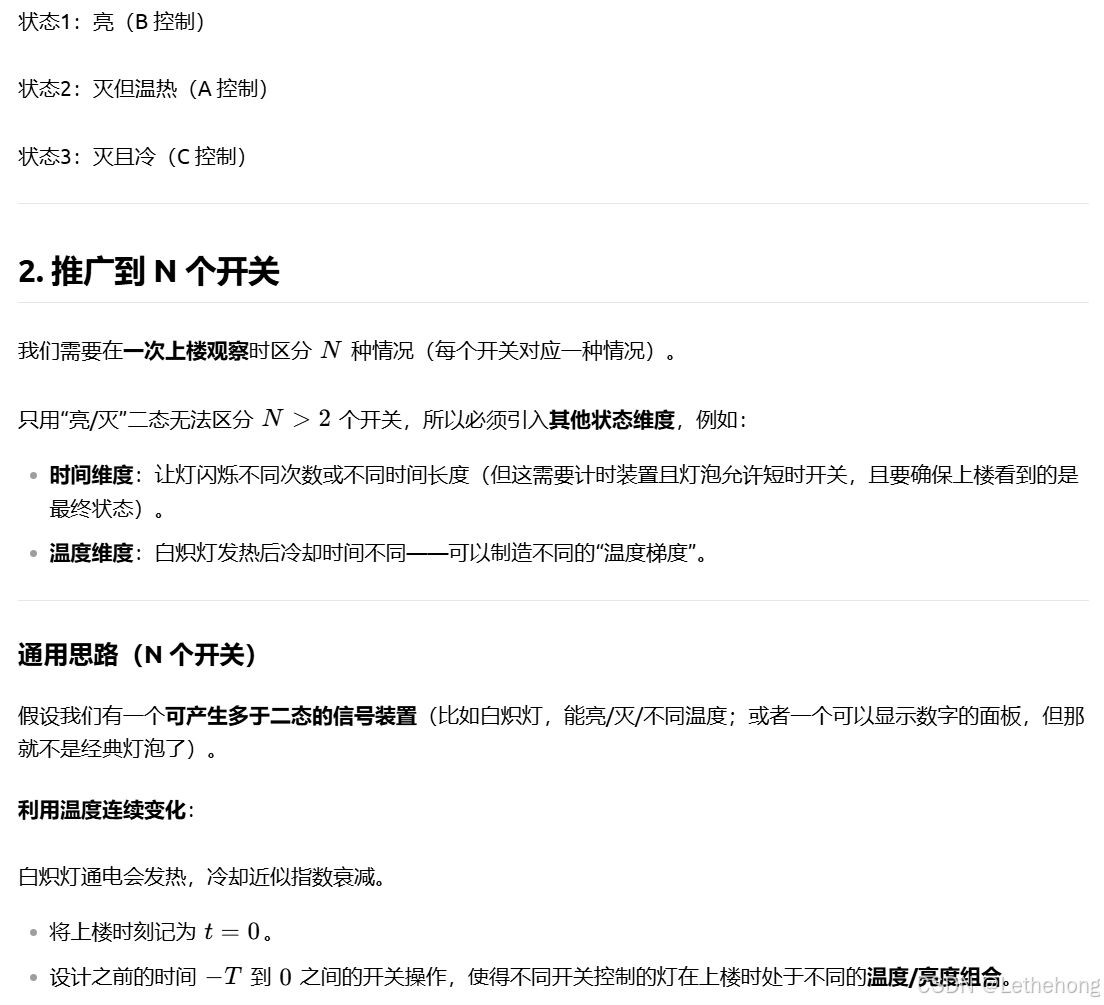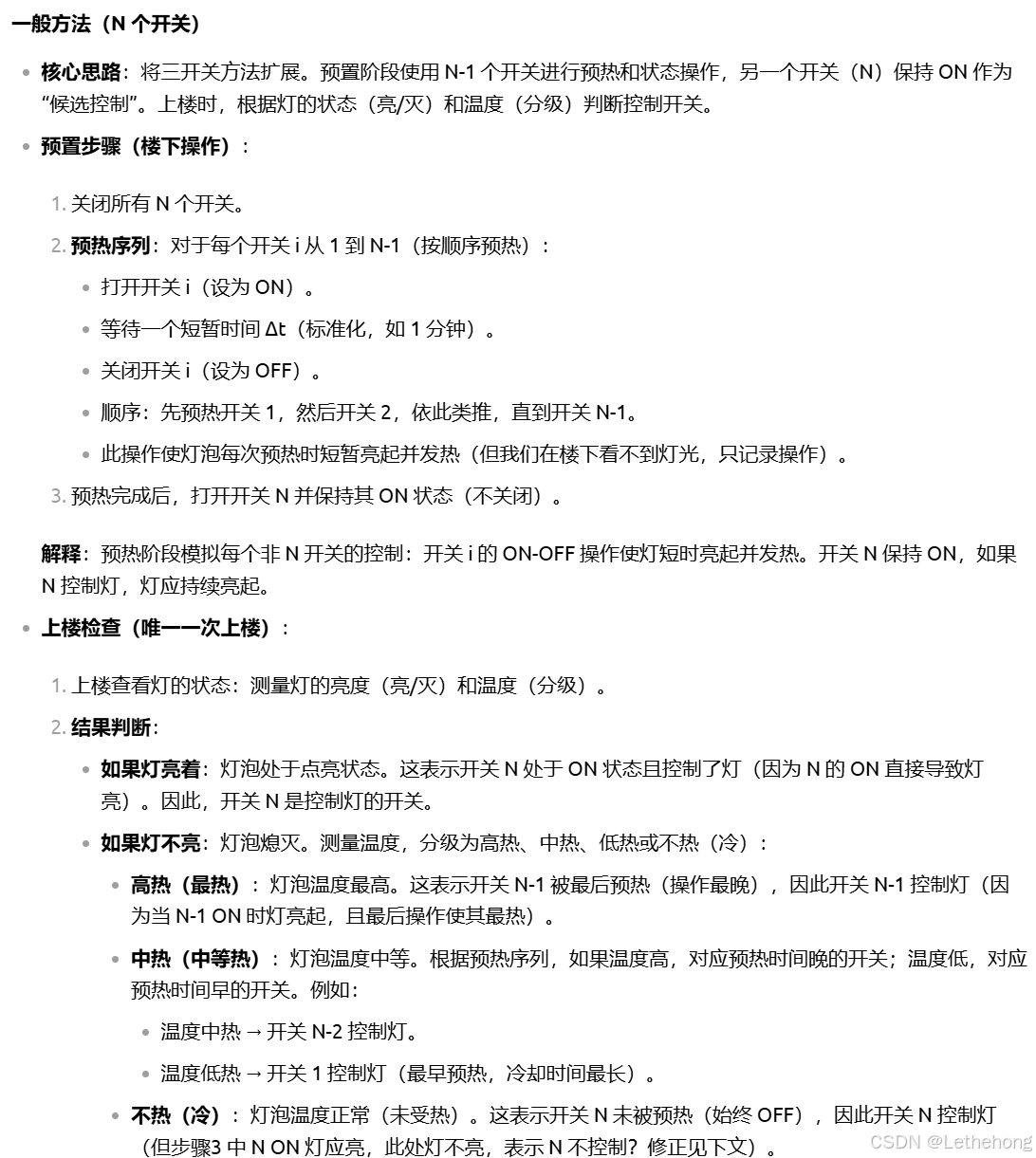 进一步扩展到 N 个开关 的一般情况,提出可通过多重状态组合(如亮/灭/热/冷、闪烁模式、延时电路等)或借助额外工具(如遥控传感器)解决,体现了较强的抽象推广能力。