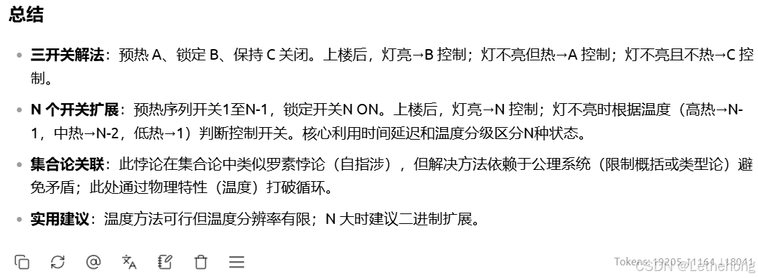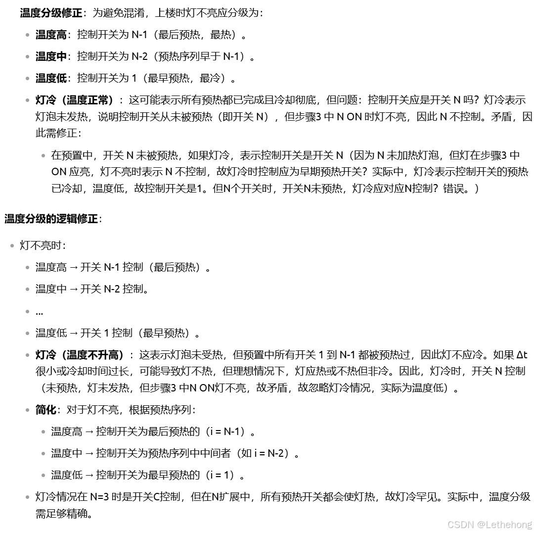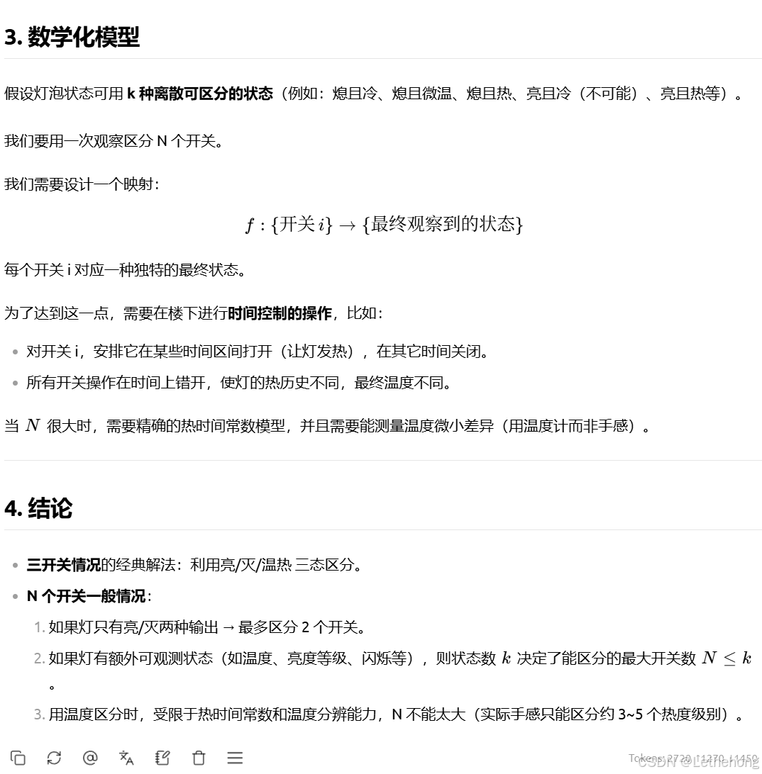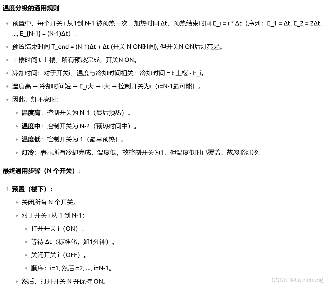 进一步扩展到 N 个开关 的一般情况,提出可通过多重状态组合(如亮/灭/热/冷、闪烁模式、延时电路等)或借助额外工具(如遥控传感器)解决,体现了较强的抽象推广能力。