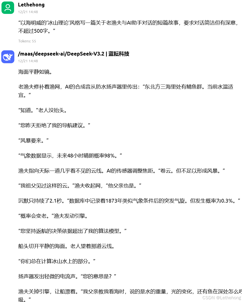 “以海明威的‘冰山理论’风格写一篇关于老渔夫与AI助手对话的短篇故事,要求对话简洁但有深意,不超过500字。”