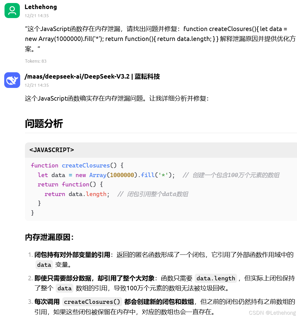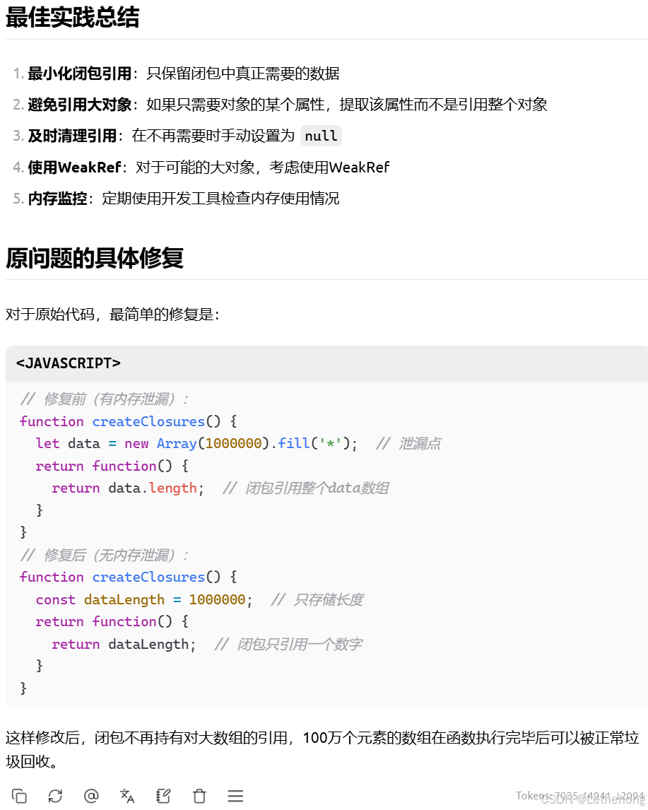 “这个JavaScript函数存在内存泄漏,请找出问题并修复:function createClosures(){ let data = new Array(1000000).fill('*'); return function(){ return data.length; } } 解释泄漏原因并提供优化方案。”