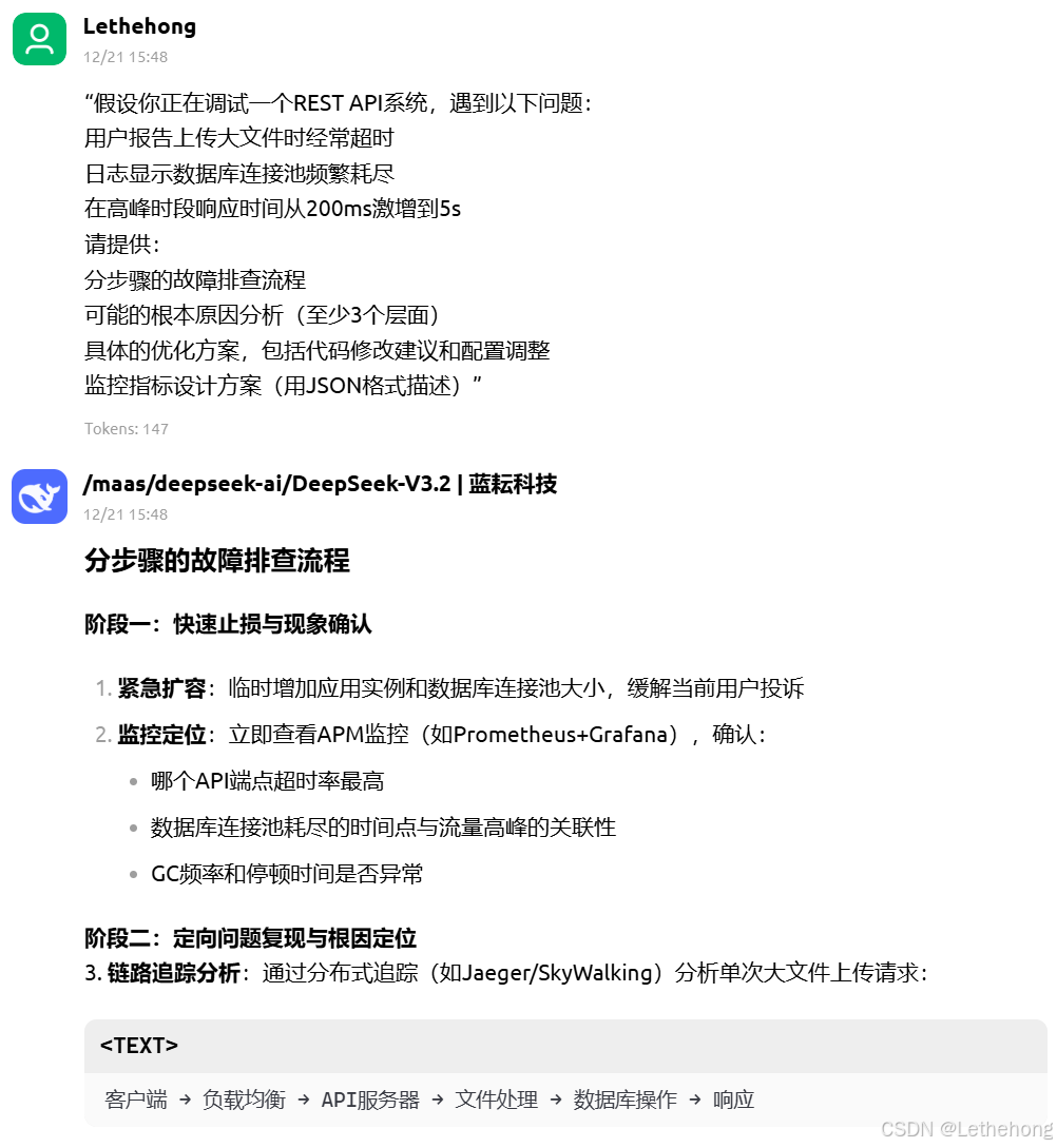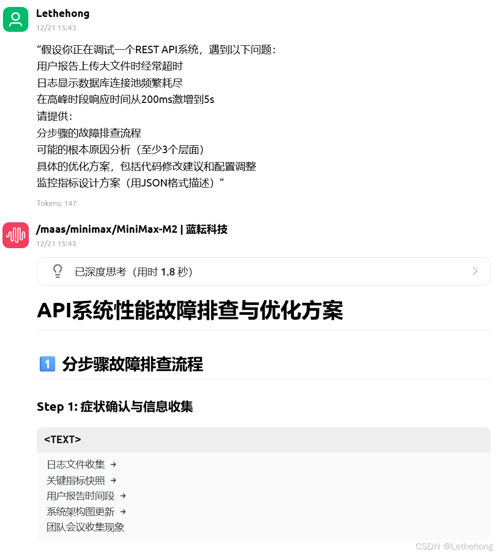 核心差异:DeepSeek‑V3.2在复杂系统设计和故障排查任务中展现出明显的系统工程优势,能够提供深度、结构化、可落地的完整解决方案,特别是在架构设计、代码实现、监控体系建设等方面表现突出。而MiniMax‑M2更侧重于提供基础可行的技术建议,适合快速解决常见问题,但在系统深度和方案完整性上存在差距。