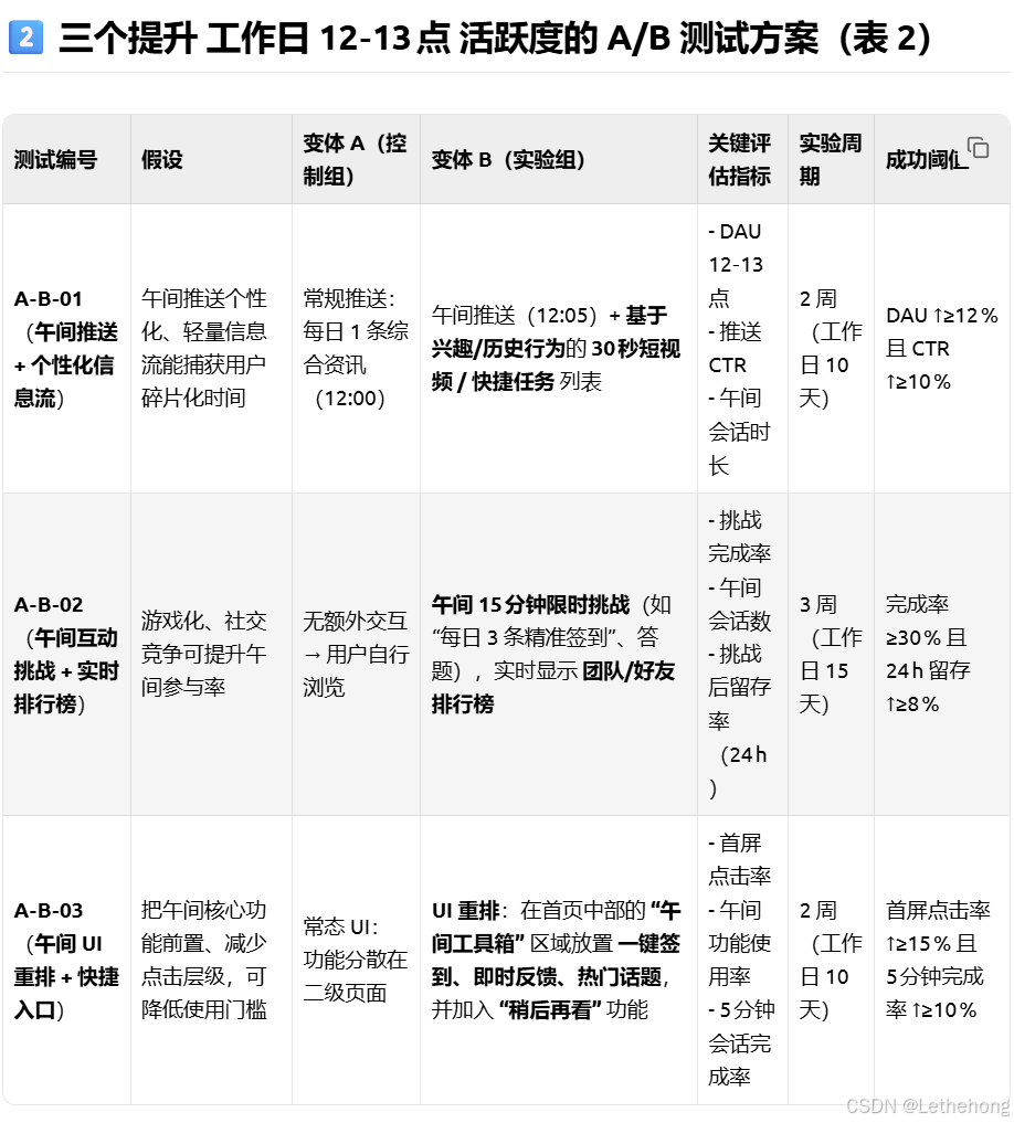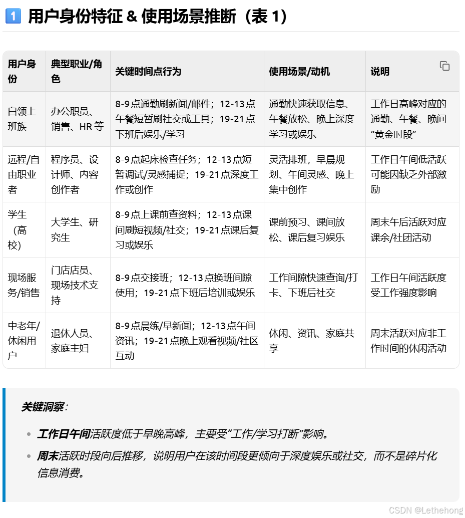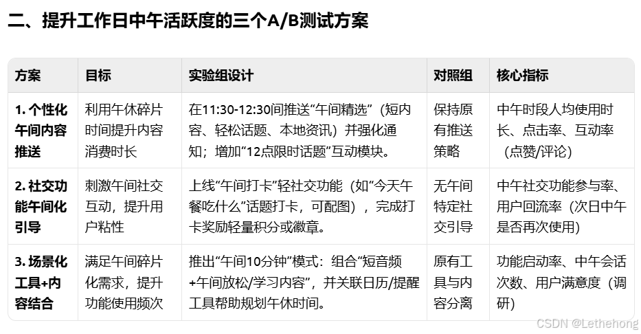 请:1. 推断用户可能的身份特征和使用场景;2. 设计三个A/B测试方案来提升工作日中午的活跃度;3. 以markdown表格形式整理你的分析。”