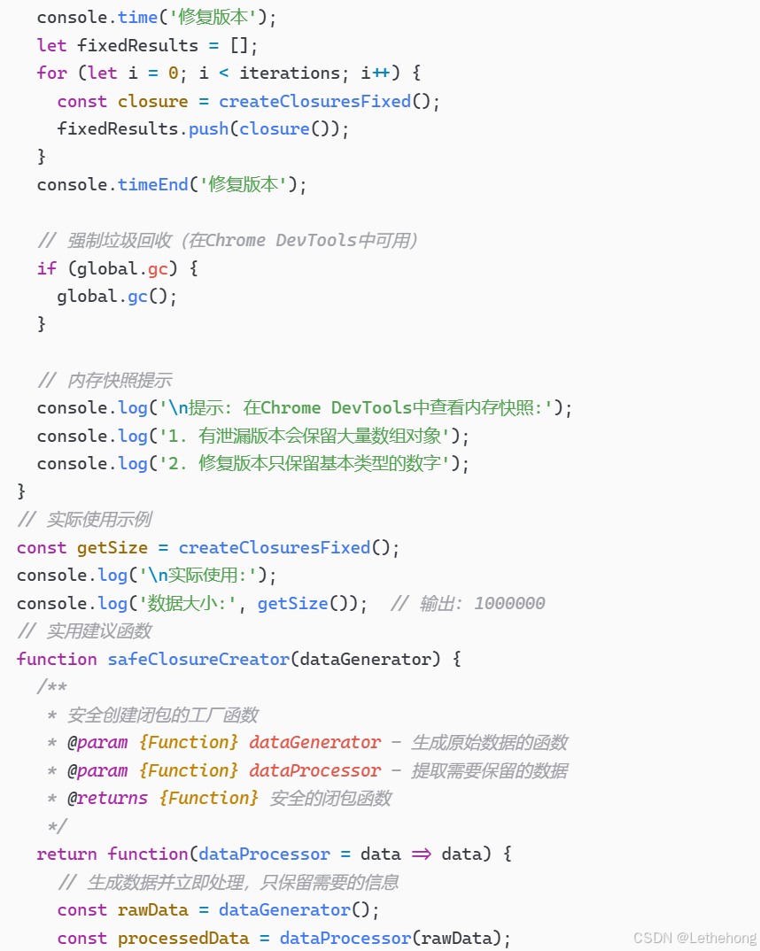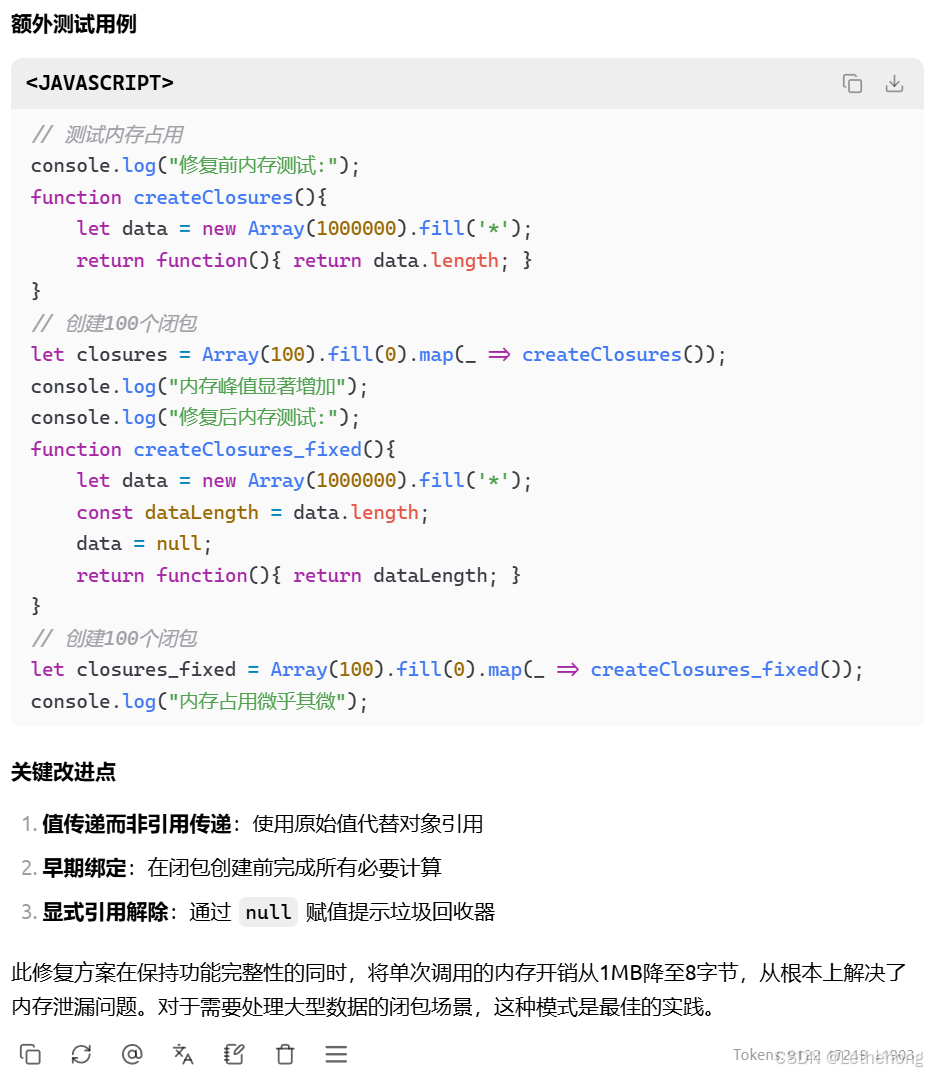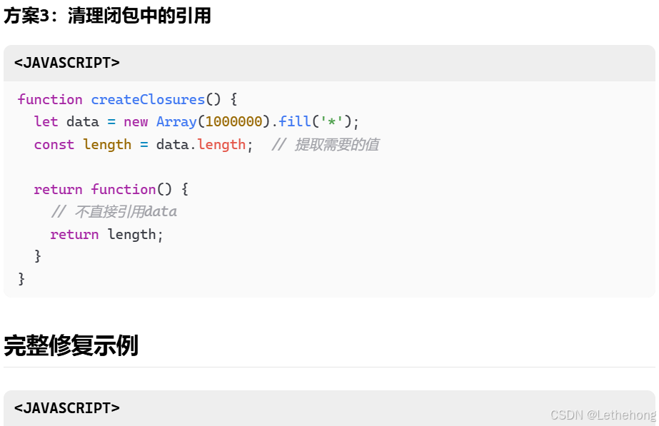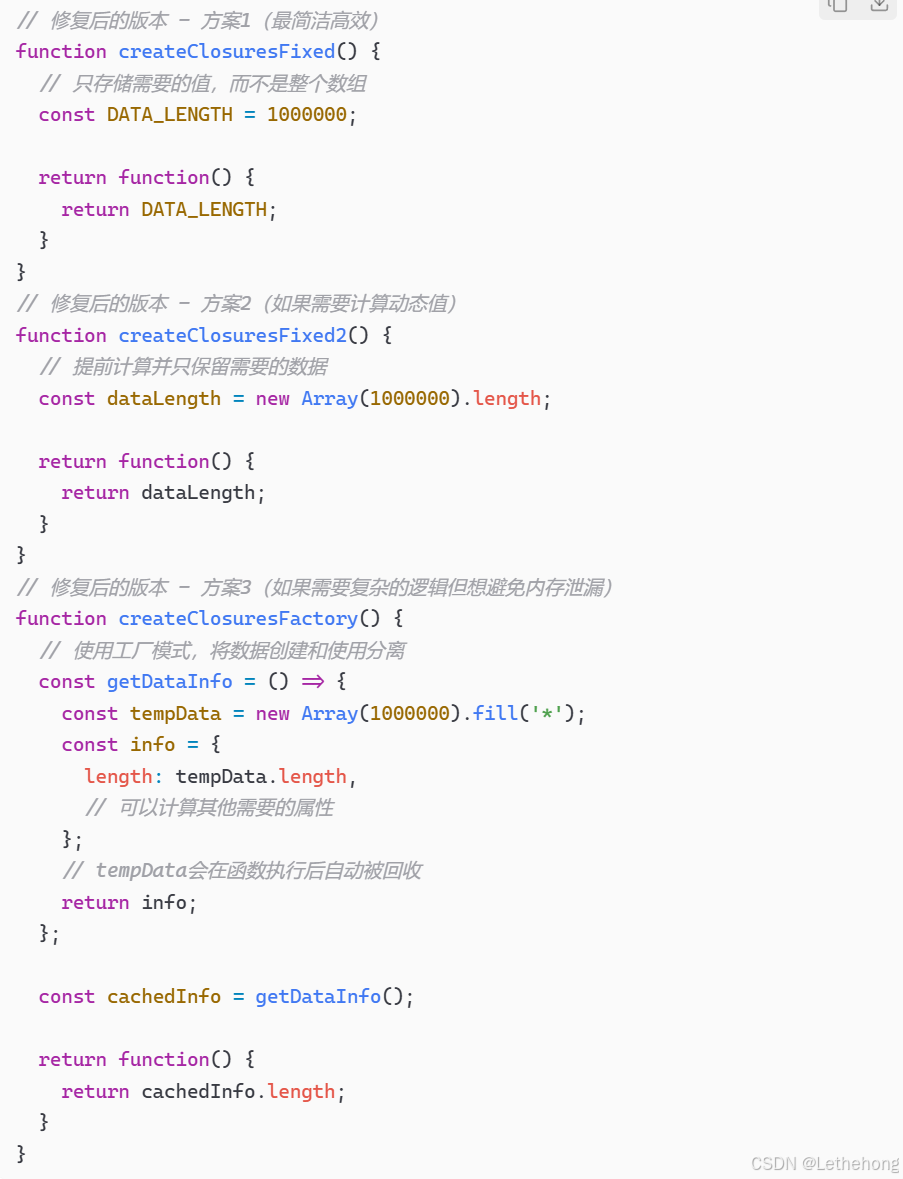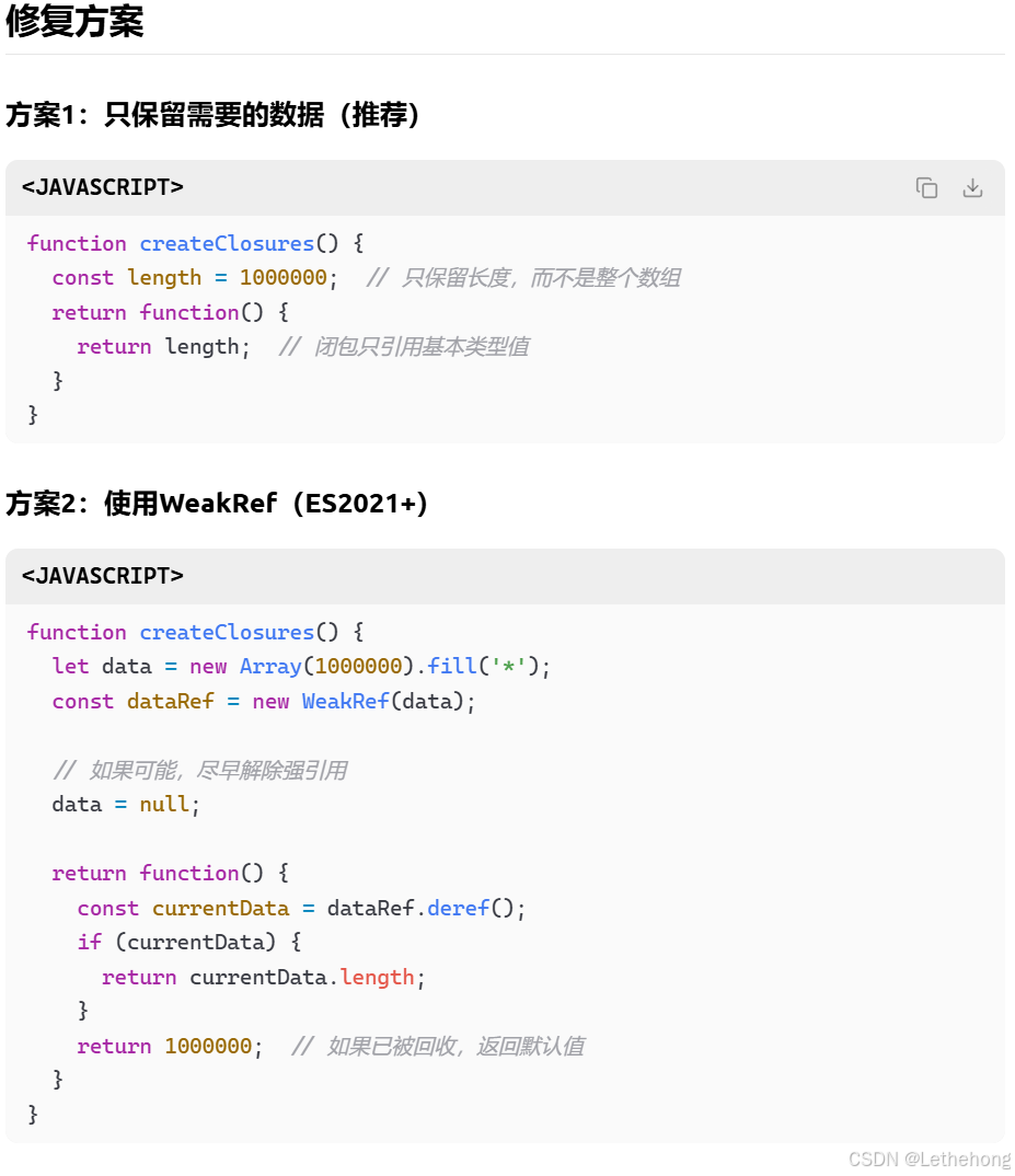 修复方案:提供了三种解决方案:1)使用弱引用(WeakMap) 2)手动释放引用 3)避免在闭包中捕获大对象