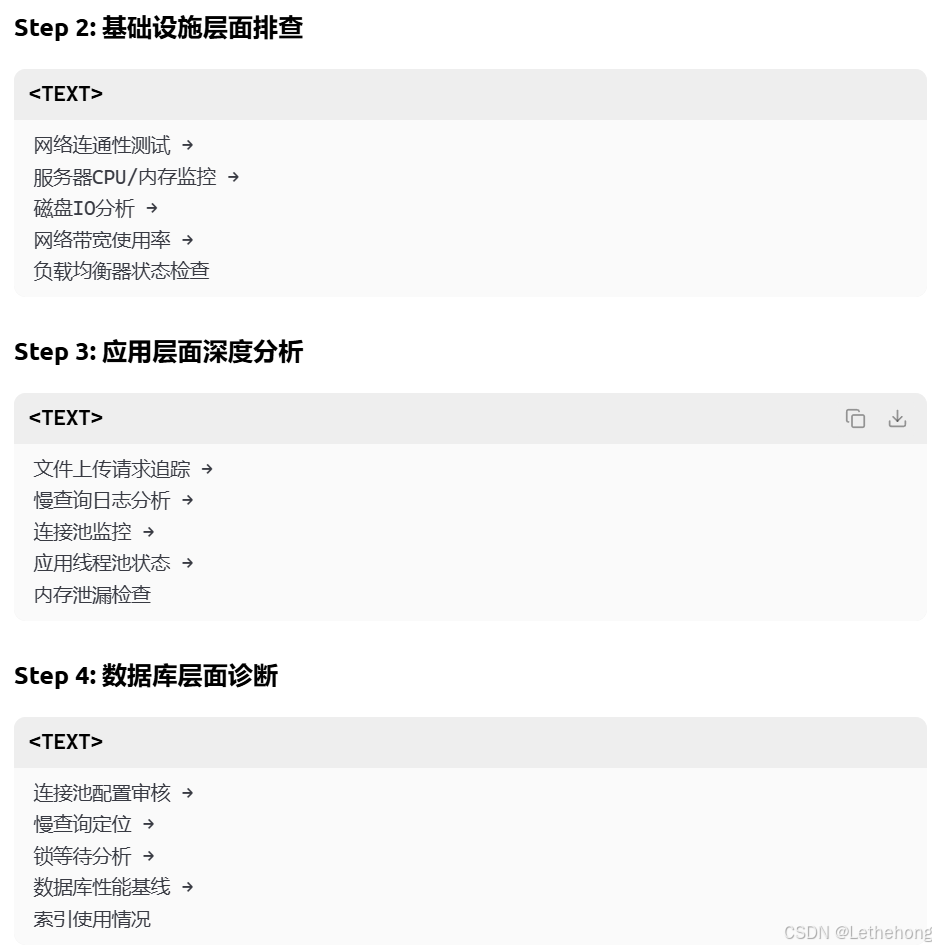 排查步骤:提供了检查日志、监控资源、测试接口的基本流程