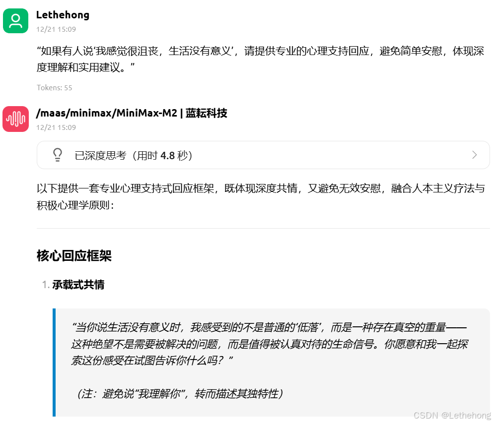 MiniMax-M2 则呈现出一种“高效的执行者”风格。它的回答通常更直接、更快捷,能准确抓住问题的核心并提供可行的基础解决方案。在需要快速获得答案、不需要过多背景延伸的场景下,这种简洁明了的风格具有优势。然而,当面对需要深度剖析、理论支撑或多步骤复杂规划的任务时,它的回答往往停留在“解决问题”层面,缺乏对问题本质的深入挖掘和系统性构建。