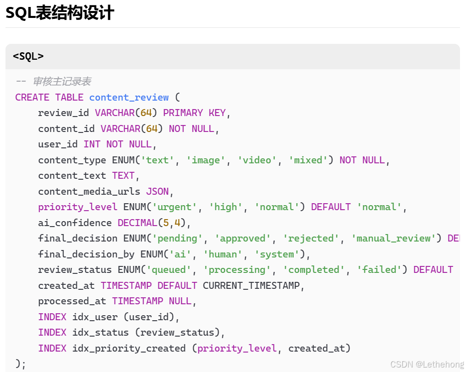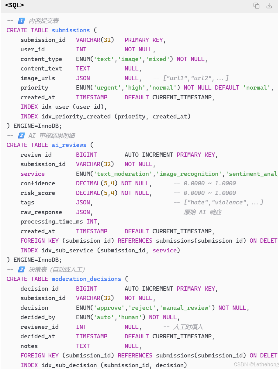 SQL表结构:设计了6个规范化表,包含主键、外键、索引、时间戳