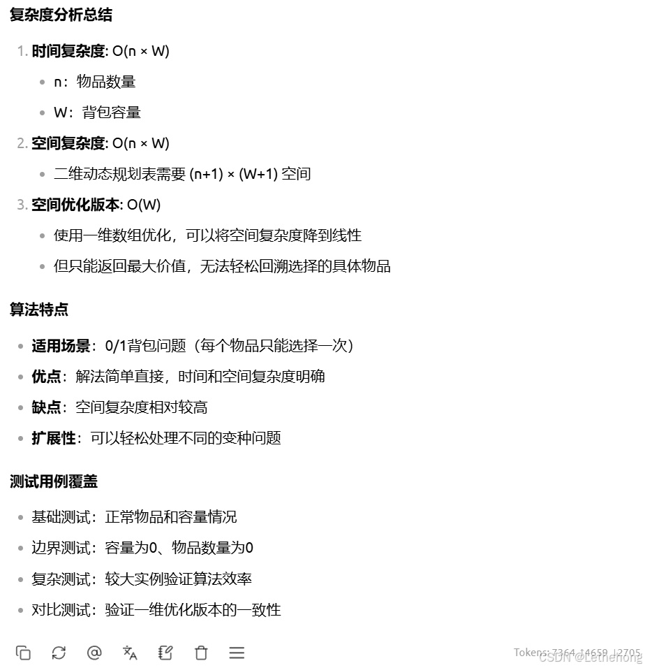 复杂度分析:明确给出时间复杂度O(n×capacity)和空间复杂度O(n×capacity),并提到空间优化版本
