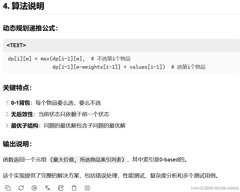 def complexity_analysis(n, capacity): """ 复杂度分析函数 时间复杂度: - 基础版本: O(n × capacity),其中n为物品数量 - 优化版本: 同上,但实际运行可能稍快 空间复杂度: - 基础版本: O(n × capacity),用于存储DP表 - 优化版本: O(capacity),使用一维数组优化 注意: 这不是多项式时间算法,而是伪多项式时间算法, 因为运行时间取决于capacity的数值大小,而不是它的位数。 """ print(f"复杂度分析:") print(f"物品数量 n = {n}") print(f"背包容量 capacity = {capacity}") print(f"\n时间复杂度: O(n × capacity) = O({n} × {capacity}) = O({n * capacity})") print(f"基础版空间复杂度: O(n × capacity) = O({n} × {capacity}) = O({n * capacity})") print(f"优化版空间复杂度: O(capacity) = O({capacity})") # 大O表示法示例 complexities = { 'time': 'O(n × W)', # W为背包容量 'space_basic': 'O(n × W)', 'space_optimized': 'O(W)' } return complexities
