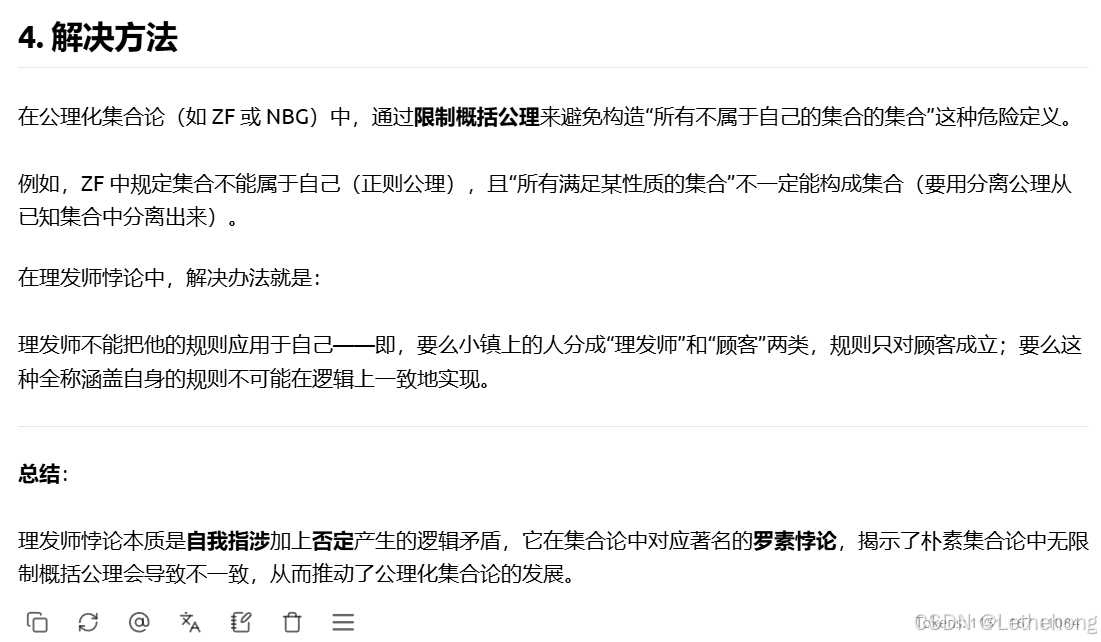 进一步将其与罗素悖论关联,指出这是“所有不属于自身的集合”这一概念的通俗版本,并简要说明了在公理化集合论(如 ZFC 系统)中如何通过限制“集合的构造”避免此类悖论。