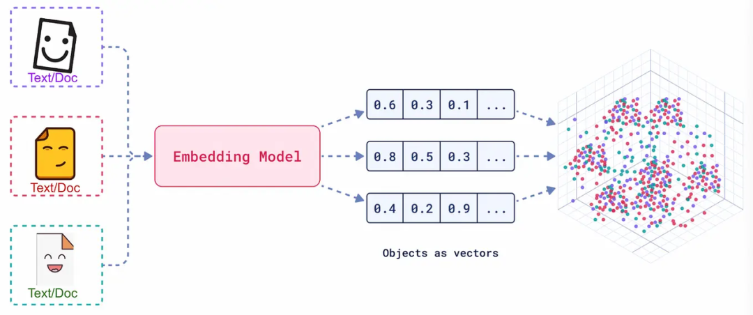 如上的embedding model也就是嵌入模型,他就是将一句话(原始对象)转为了一个向量(向量空间的一个点),这个向量可以表示为[0.5, 1.2, -0.7, …],实际向量长度有512 768 1024甚至更长的。长度越长,可以表达的信息越丰富,当然存储与计算量也越大。