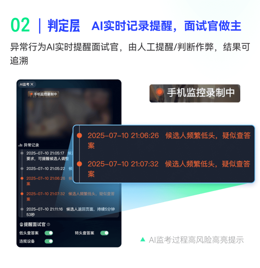 - 电脑+手机双视角监控:主画面看候选人,副屏自动拍摄周边环境