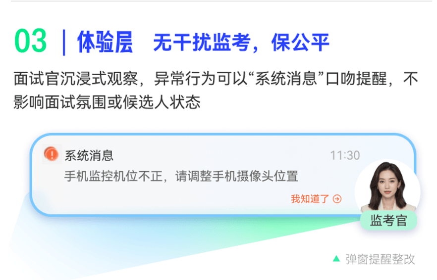 - 系统以“系统消息”形式提醒(如“手机位置不正”),不影响面试氛围